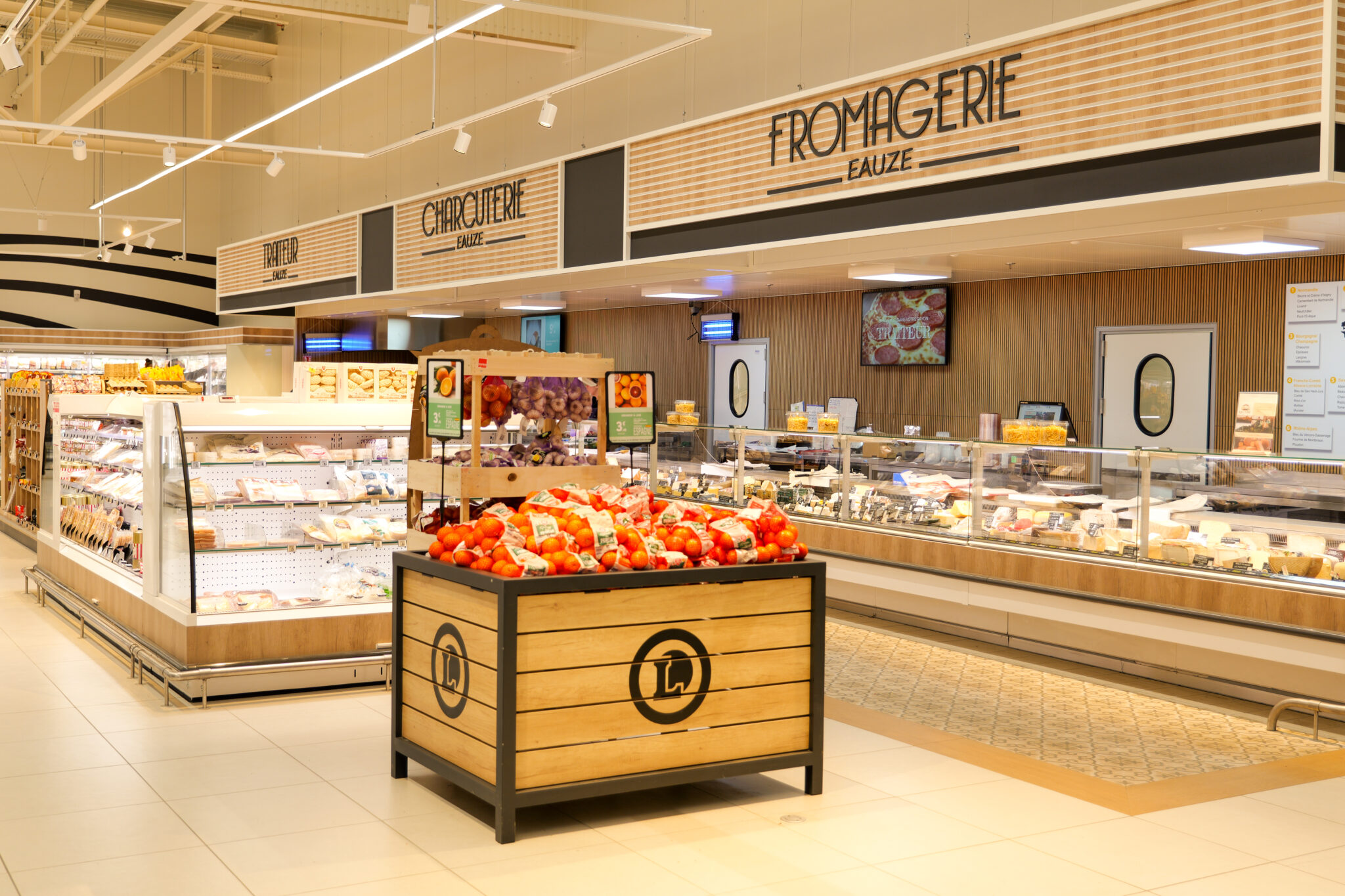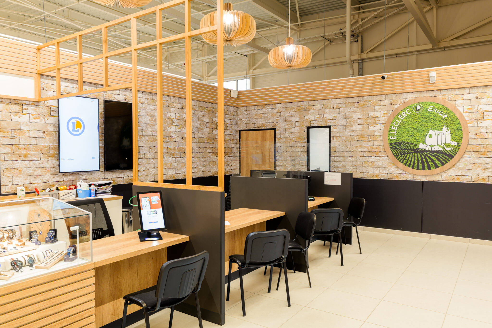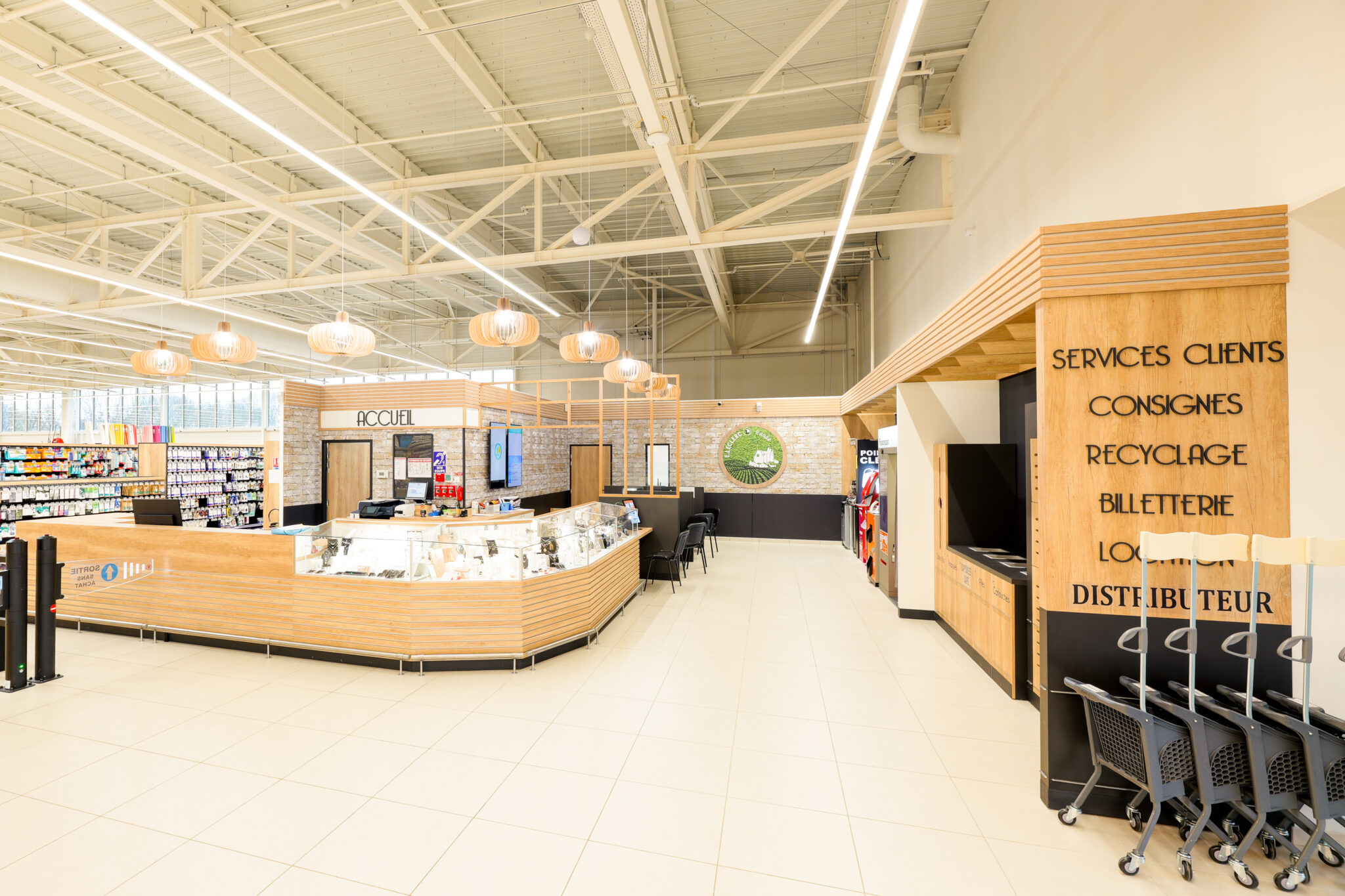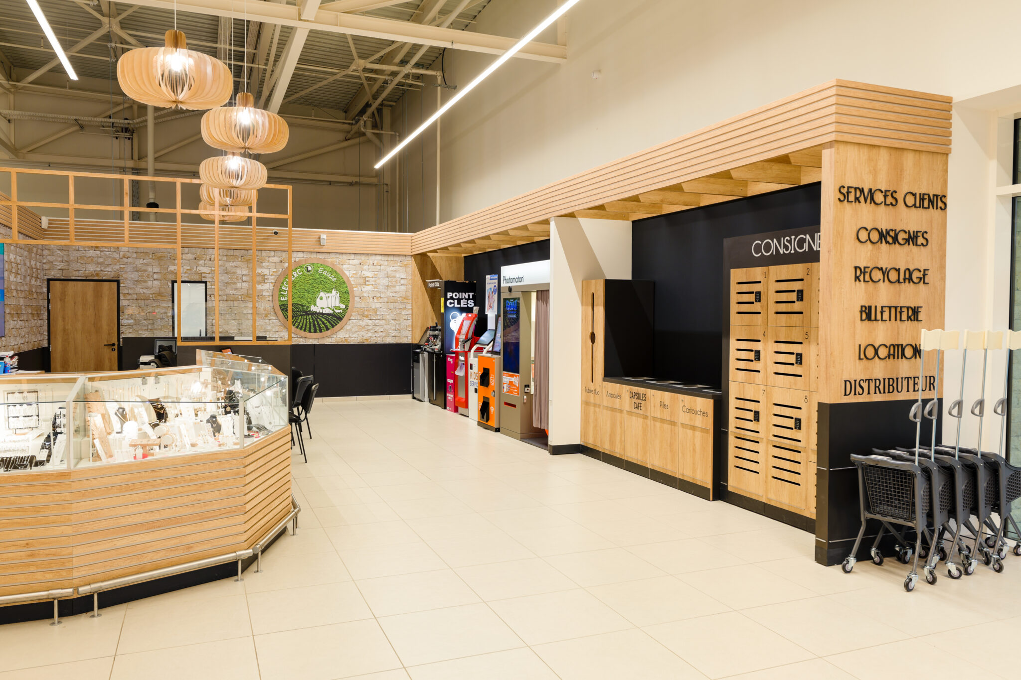 Le parcours client s’inscrit dans cette continuité paysagère, évoquant la douceur des coteaux et la simplicité rurale, pour créer une ambiance apaisante, feutrée et efficace ; les bandeaux hauts de la ligne de frais, en résonance avec les comptoirs métiers, structurent les volumes, valorisent les pôles stratégiques et participent à un environnement marchand harmonieux, lisible et accueillant, conjuguant confort visuel et performance commerciale.