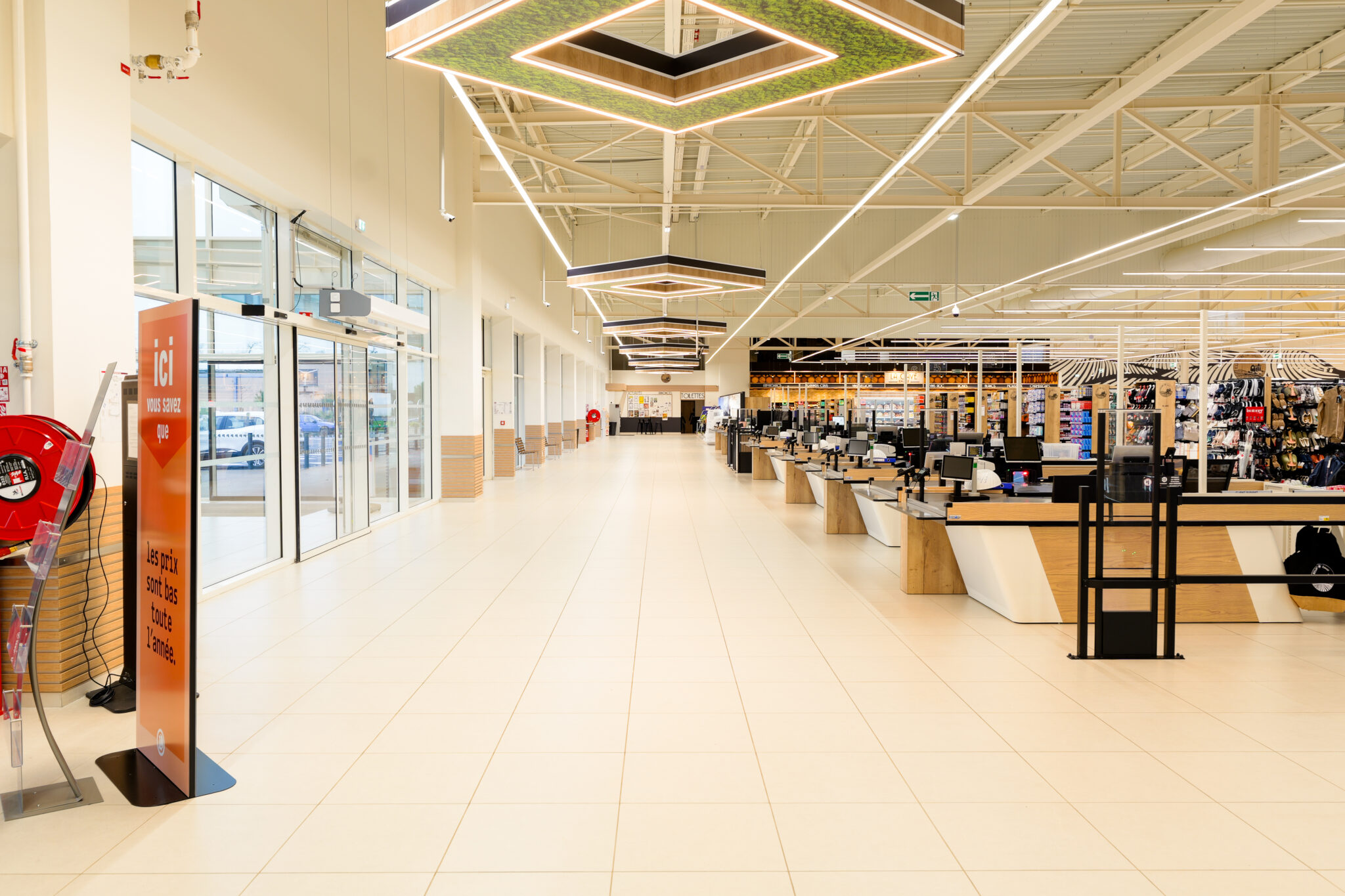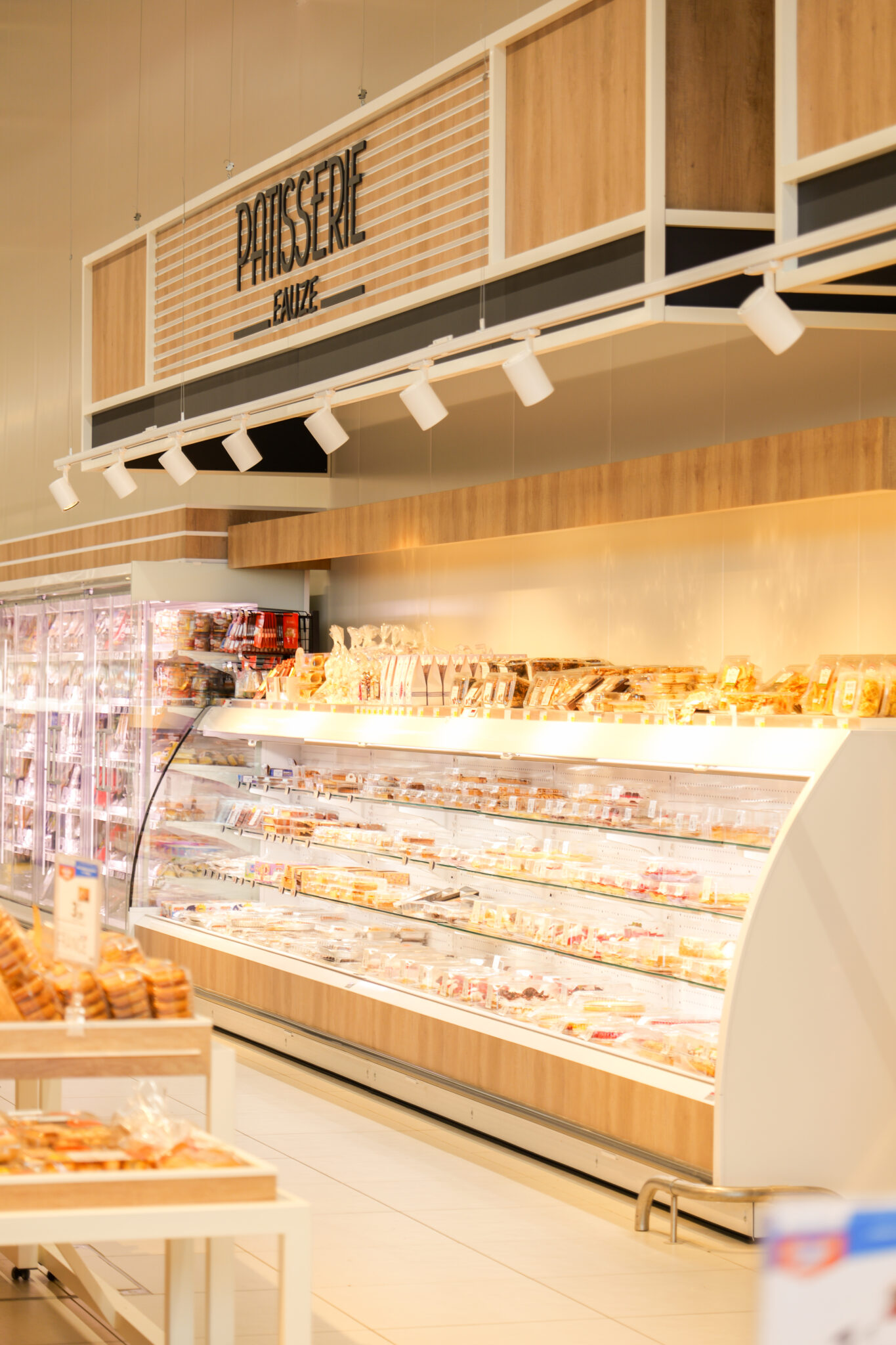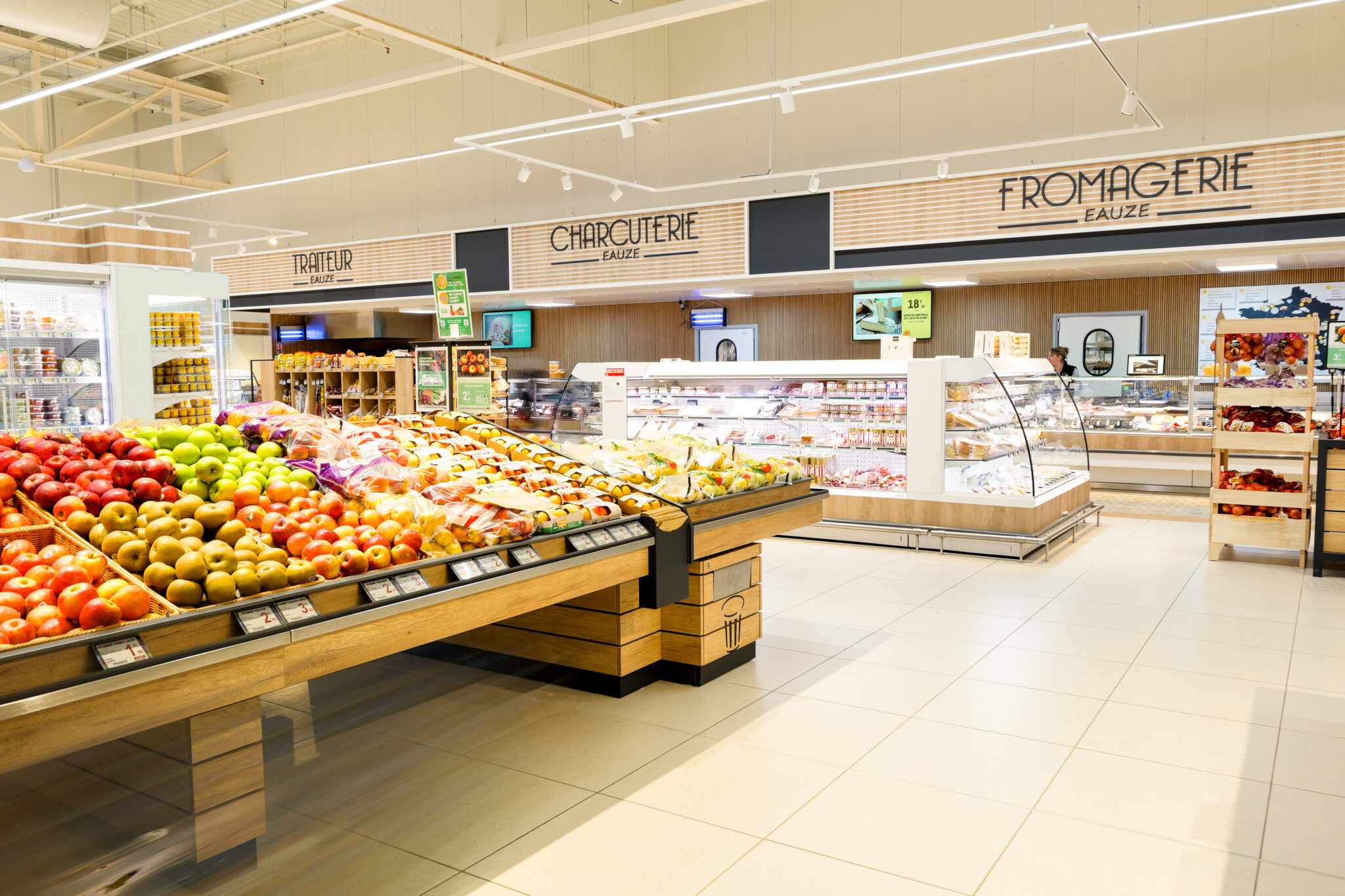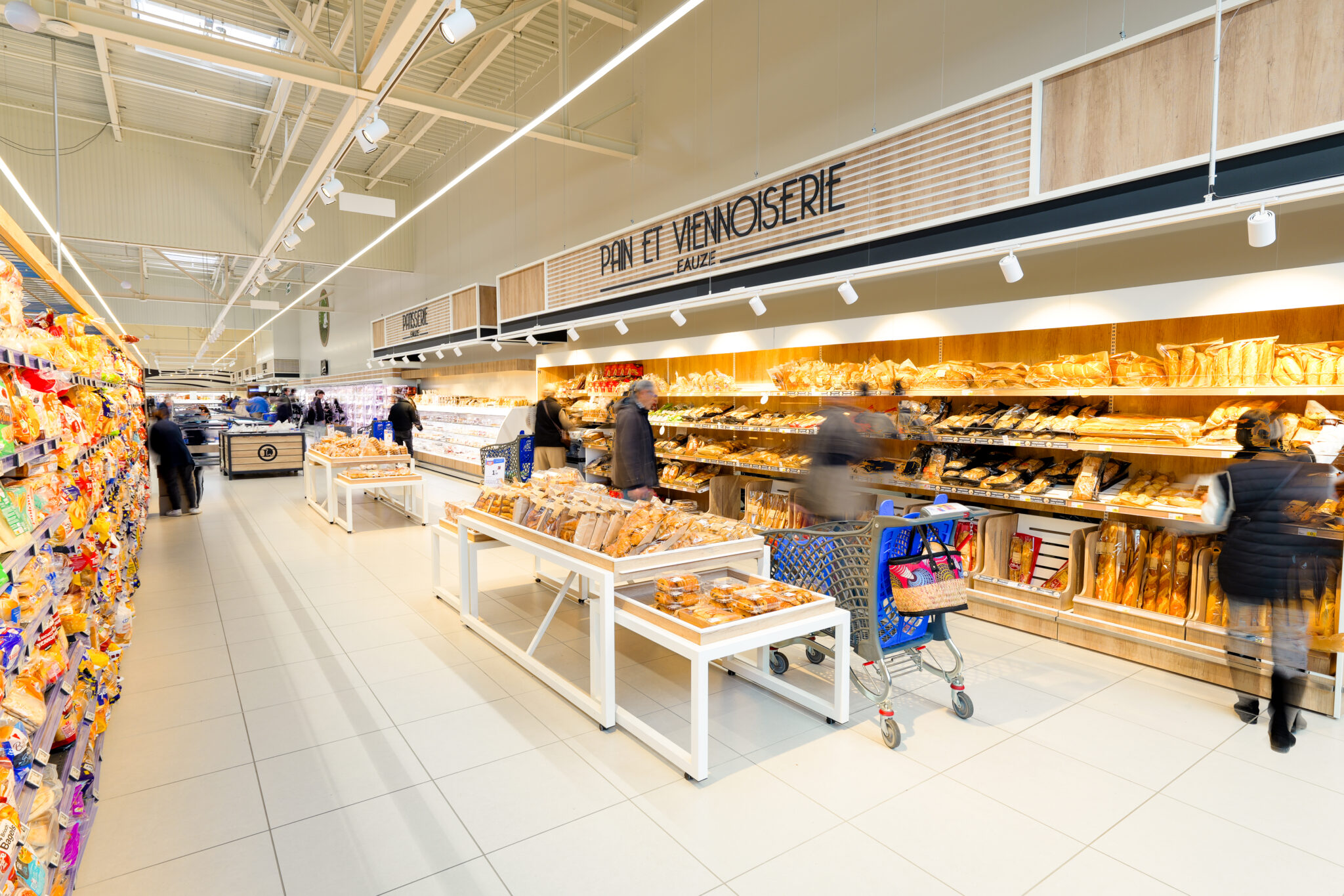 Le parcours client s’inscrit dans cette continuité paysagère, évoquant la douceur des coteaux et la simplicité rurale, pour créer une ambiance apaisante, feutrée et efficace ; les bandeaux hauts de la ligne de frais, en résonance avec les comptoirs métiers, structurent les volumes, valorisent les pôles stratégiques et participent à un environnement marchand harmonieux, lisible et accueillant, conjuguant confort visuel et performance commerciale.