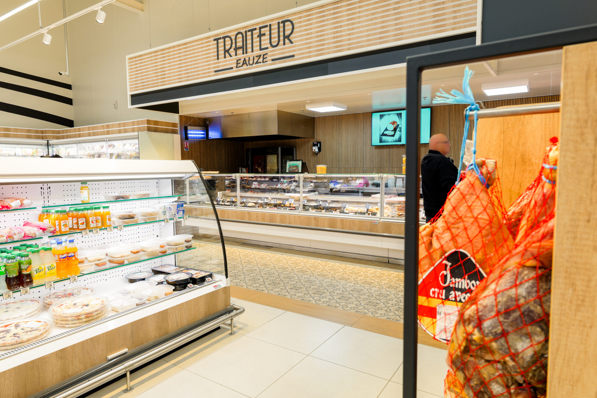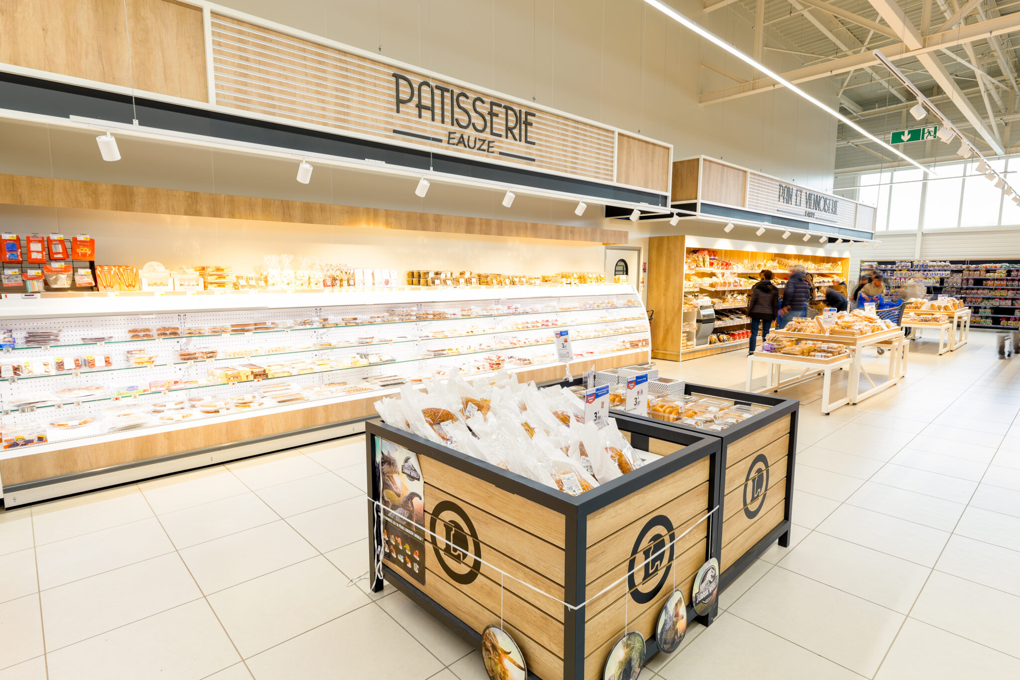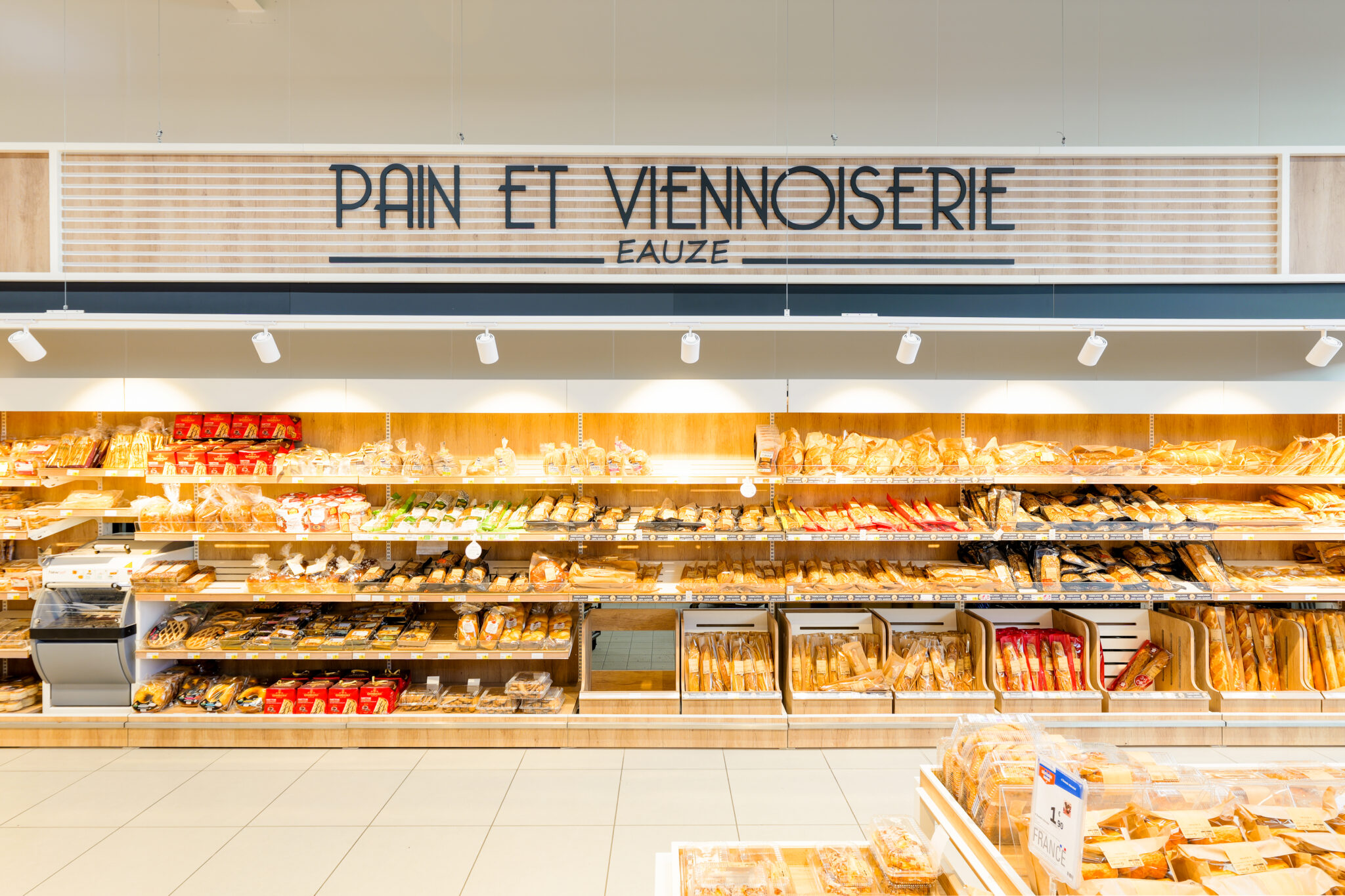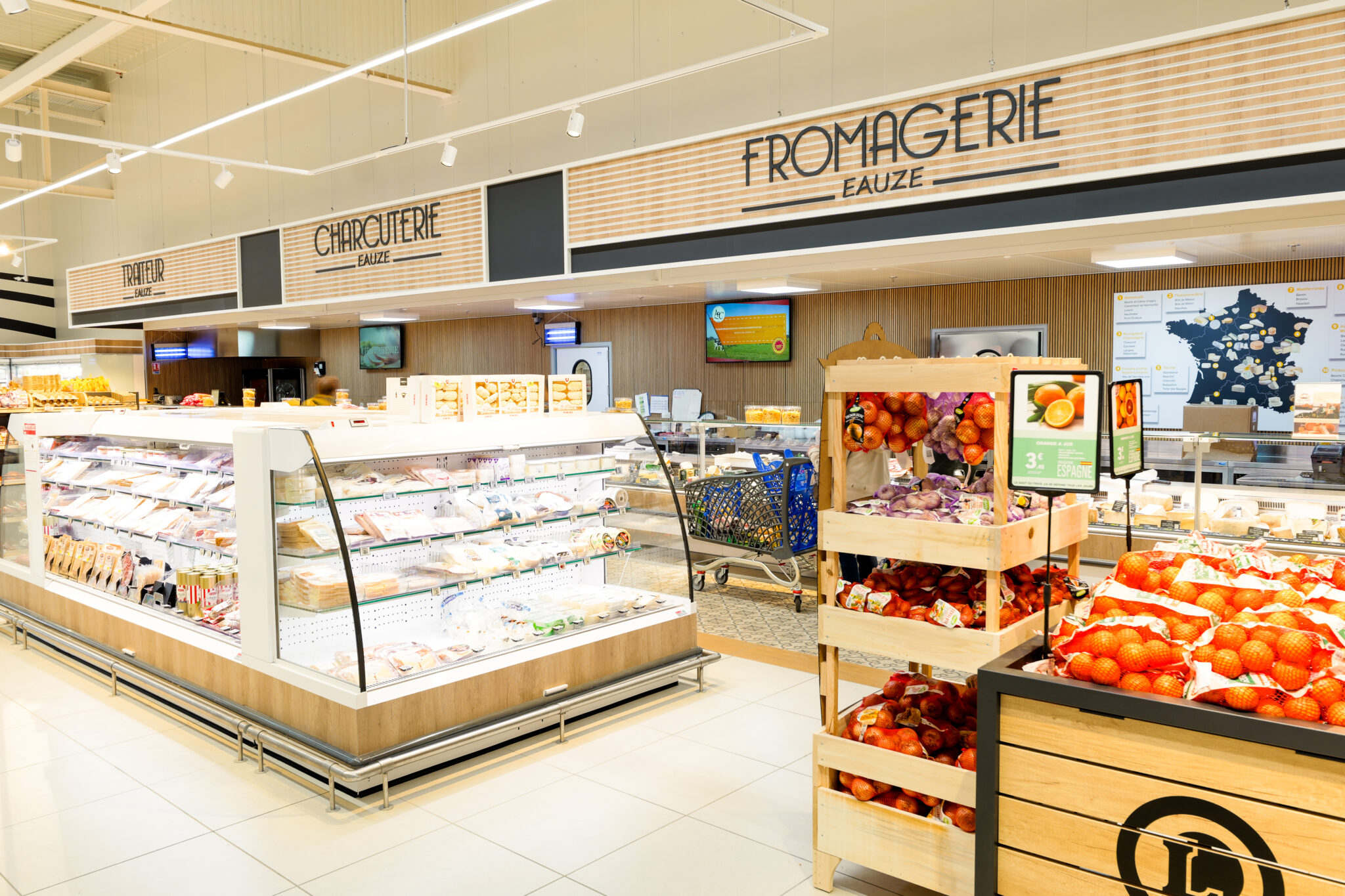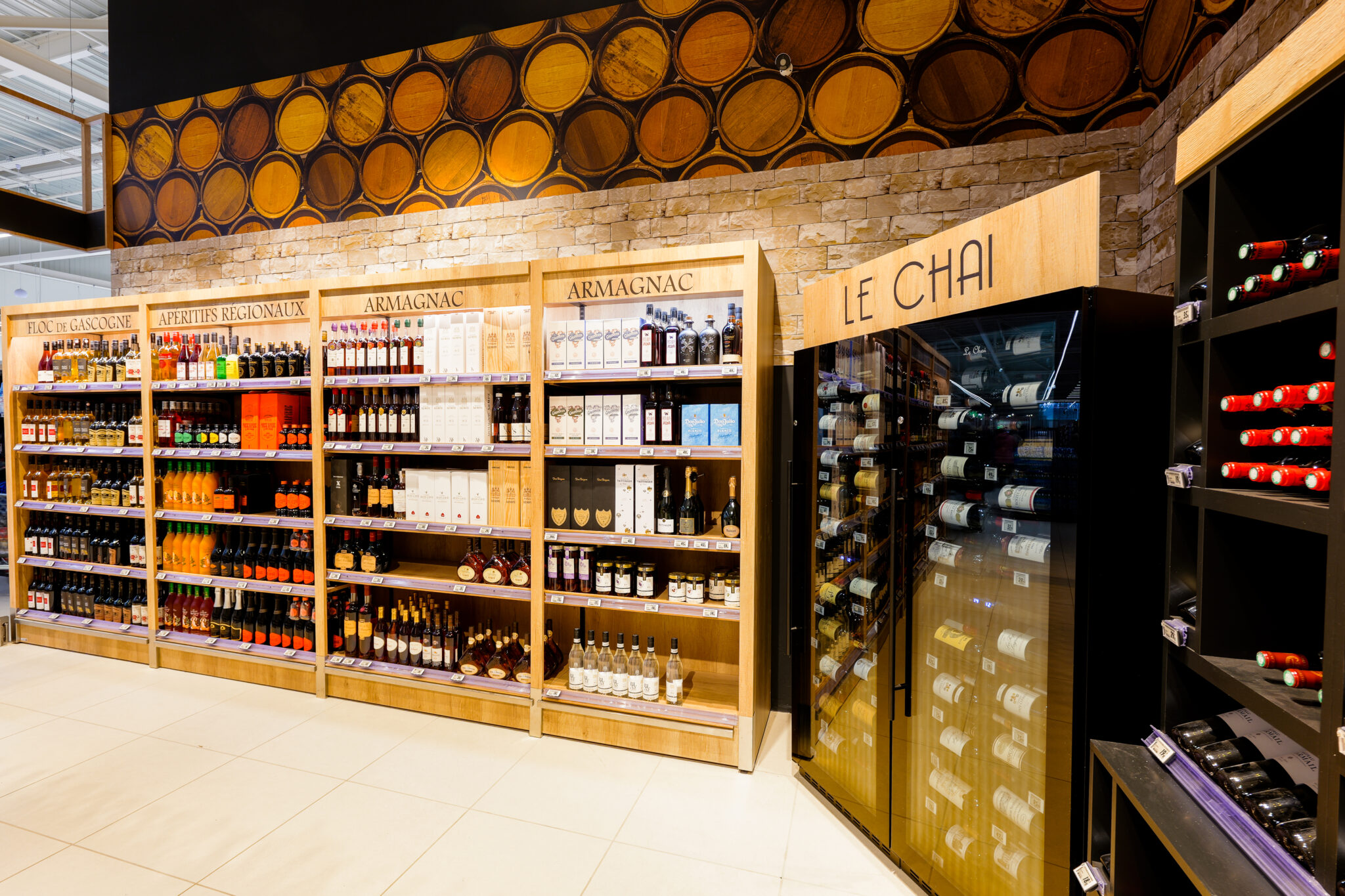 Le parcours client s’inscrit dans cette continuité paysagère, évoquant la douceur des coteaux et la simplicité rurale, pour créer une ambiance apaisante, feutrée et efficace ; les bandeaux hauts de la ligne de frais, en résonance avec les comptoirs métiers, structurent les volumes, valorisent les pôles stratégiques et participent à un environnement marchand harmonieux, lisible et accueillant, conjuguant confort visuel et performance commerciale.