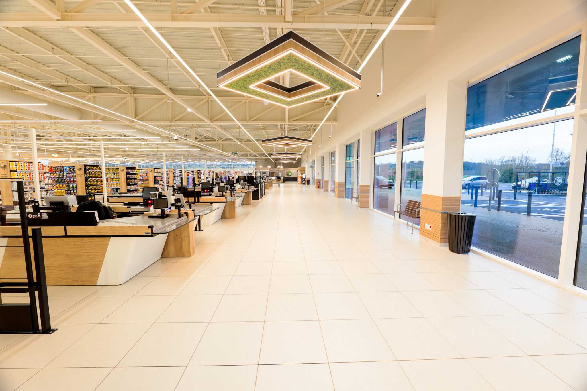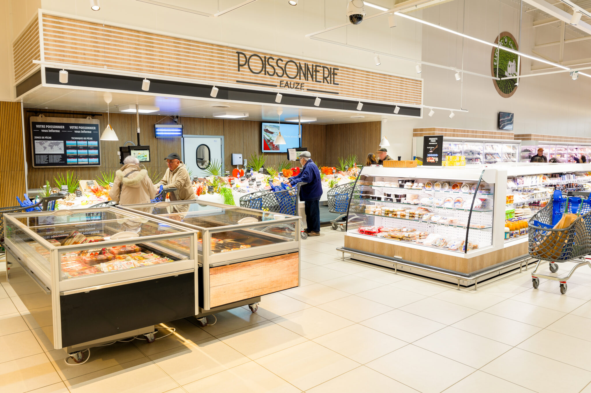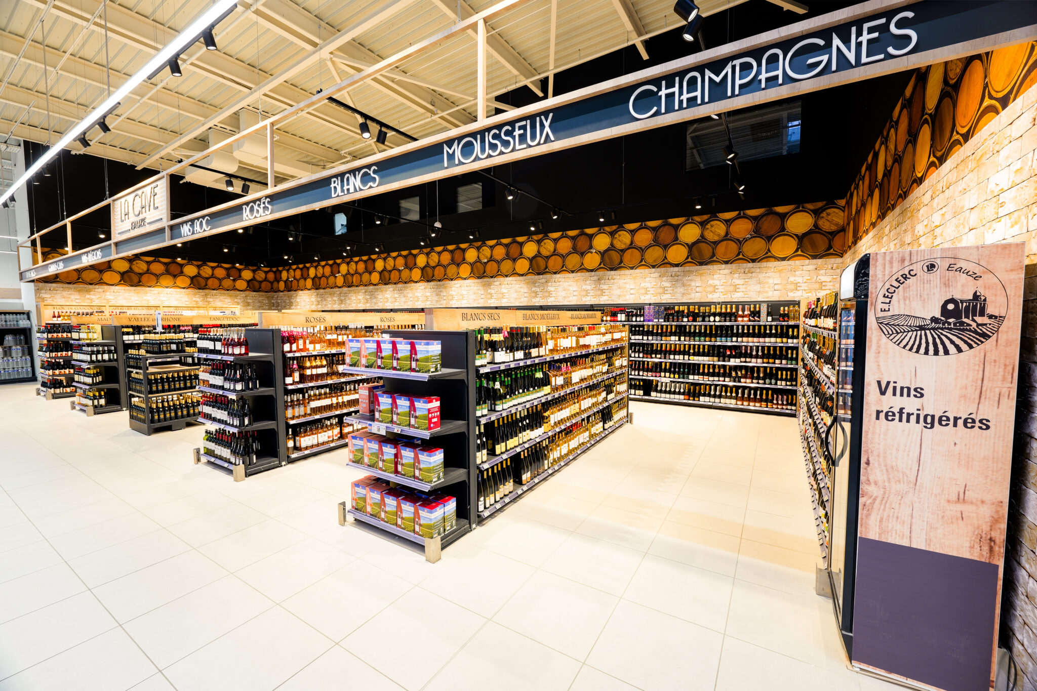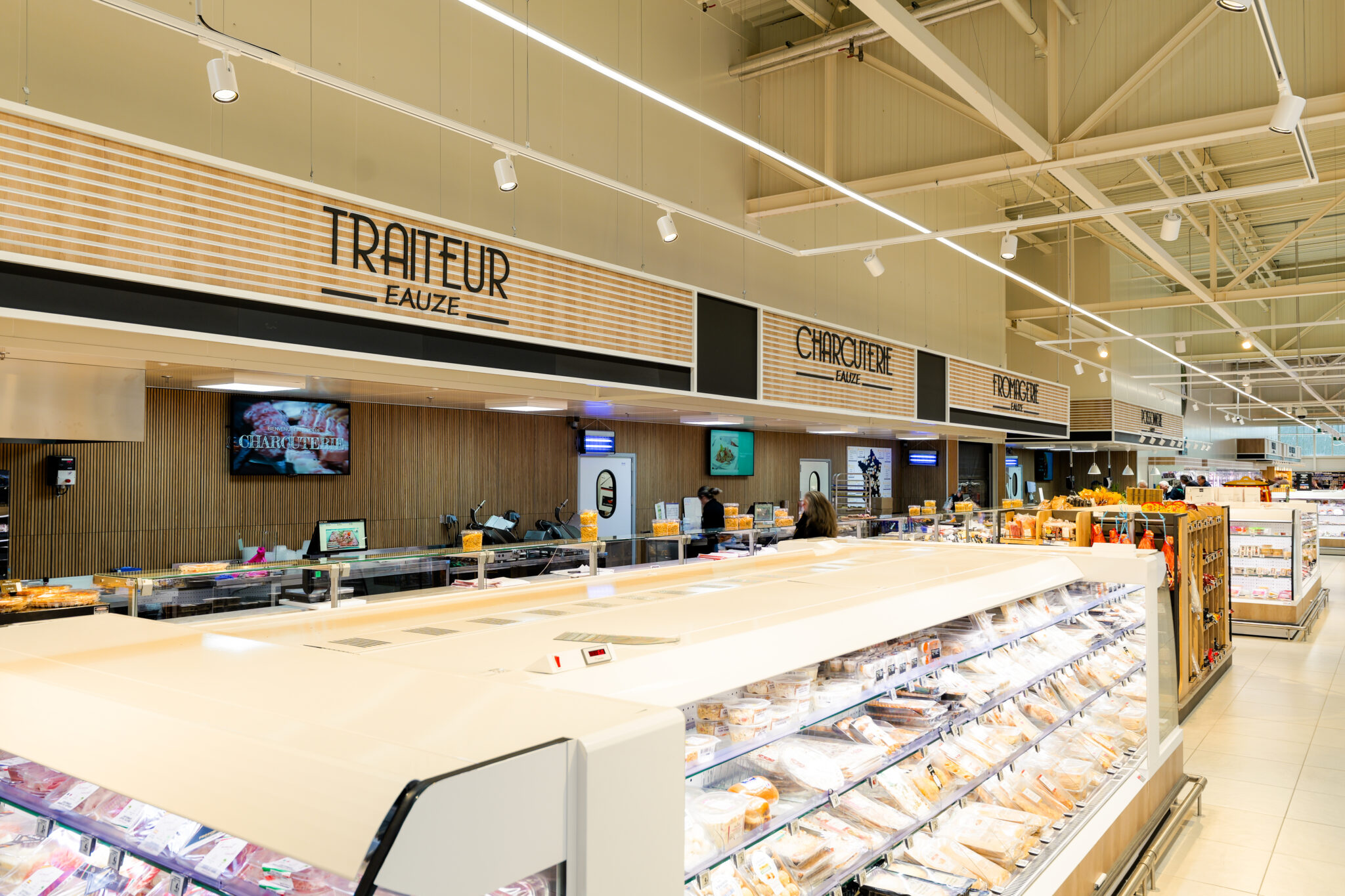 Le parcours client s’inscrit dans cette continuité paysagère, évoquant la douceur des coteaux et la simplicité rurale, pour créer une ambiance apaisante, feutrée et efficace ; les bandeaux hauts de la ligne de frais, en résonance avec les comptoirs métiers, structurent les volumes, valorisent les pôles stratégiques et participent à un environnement marchand harmonieux, lisible et accueillant, conjuguant confort visuel et performance commerciale.