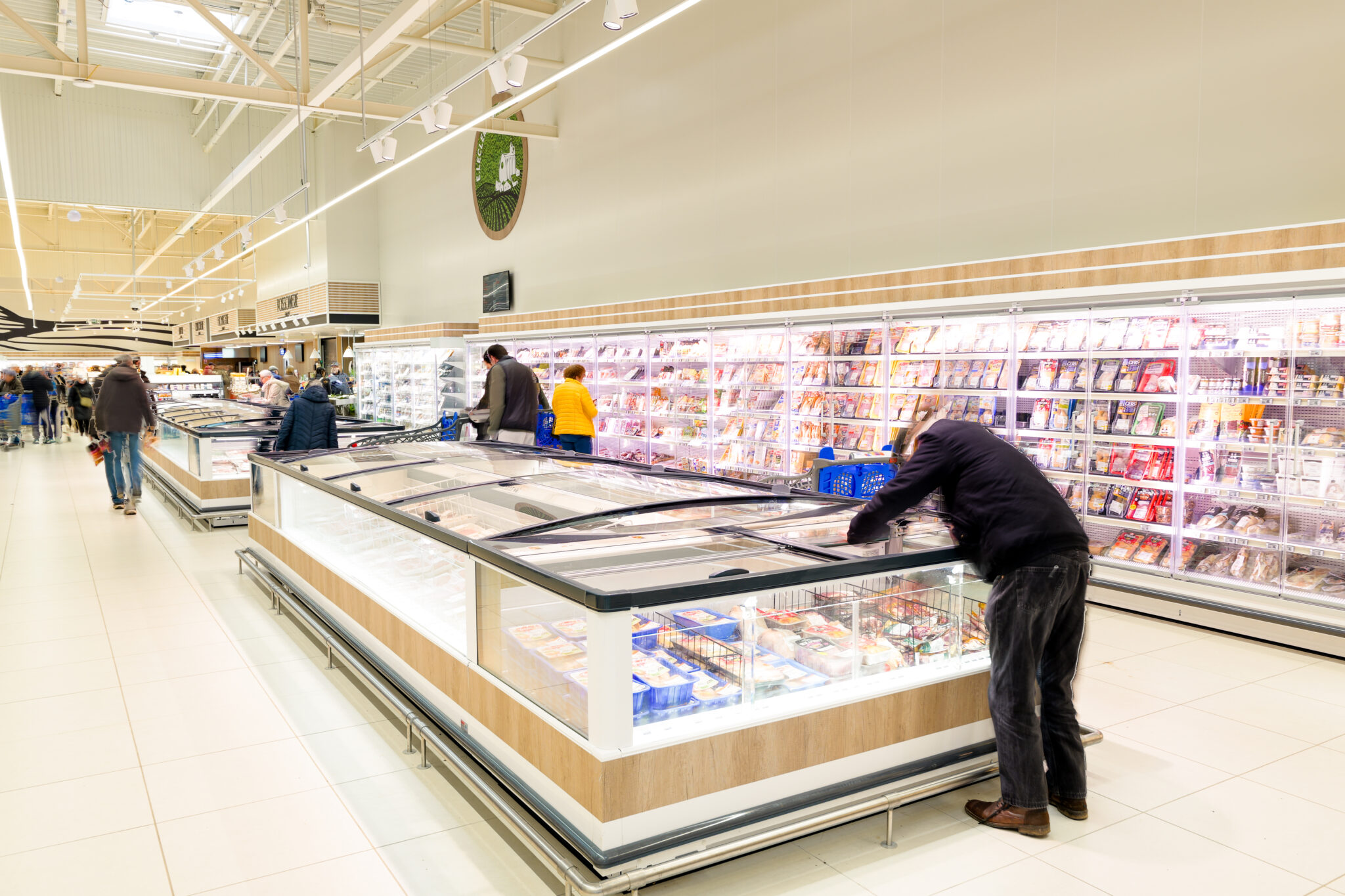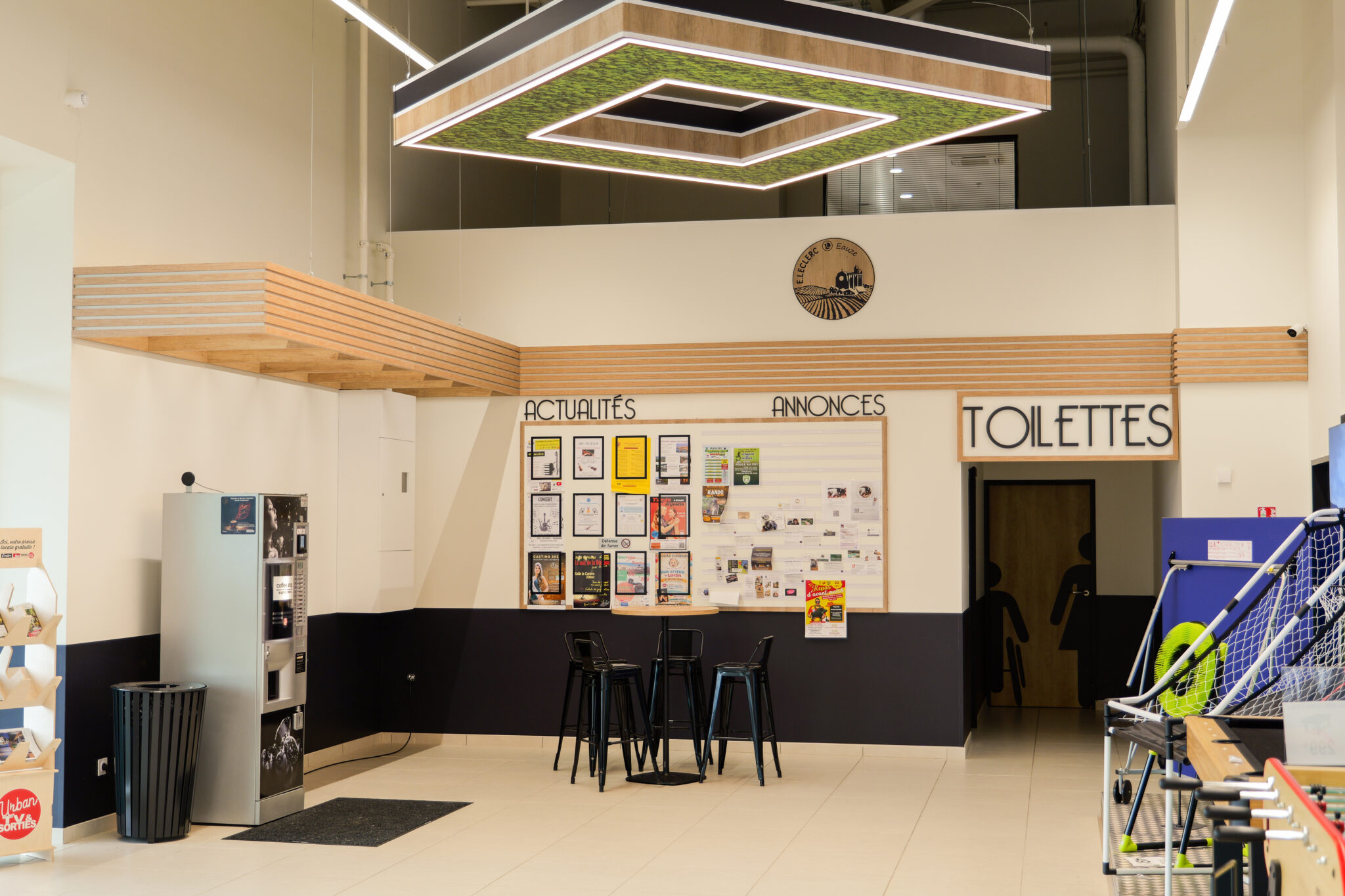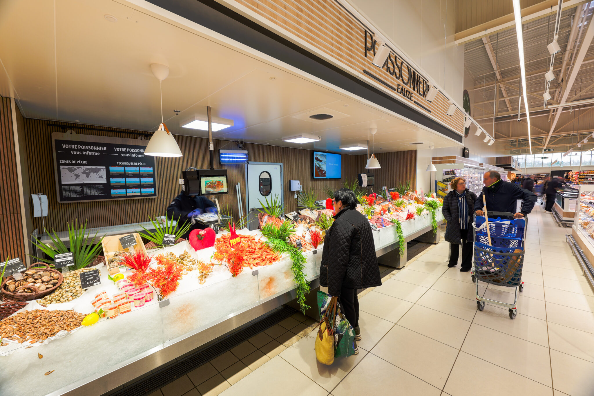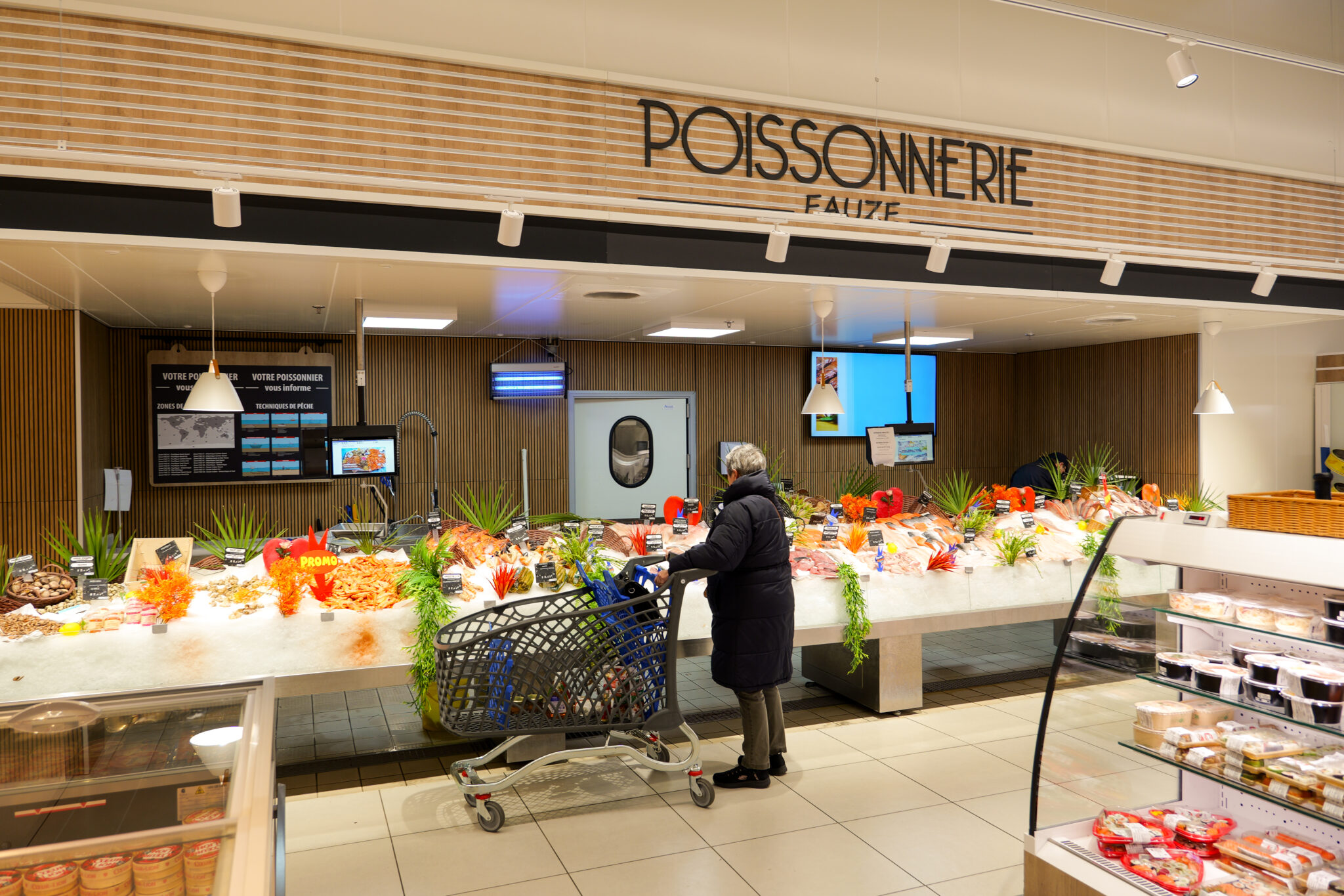 Le parcours client s’inscrit dans cette continuité paysagère, évoquant la douceur des coteaux et la simplicité rurale, pour créer une ambiance apaisante, feutrée et efficace ; les bandeaux hauts de la ligne de frais, en résonance avec les comptoirs métiers, structurent les volumes, valorisent les pôles stratégiques et participent à un environnement marchand harmonieux, lisible et accueillant, conjuguant confort visuel et performance commerciale.