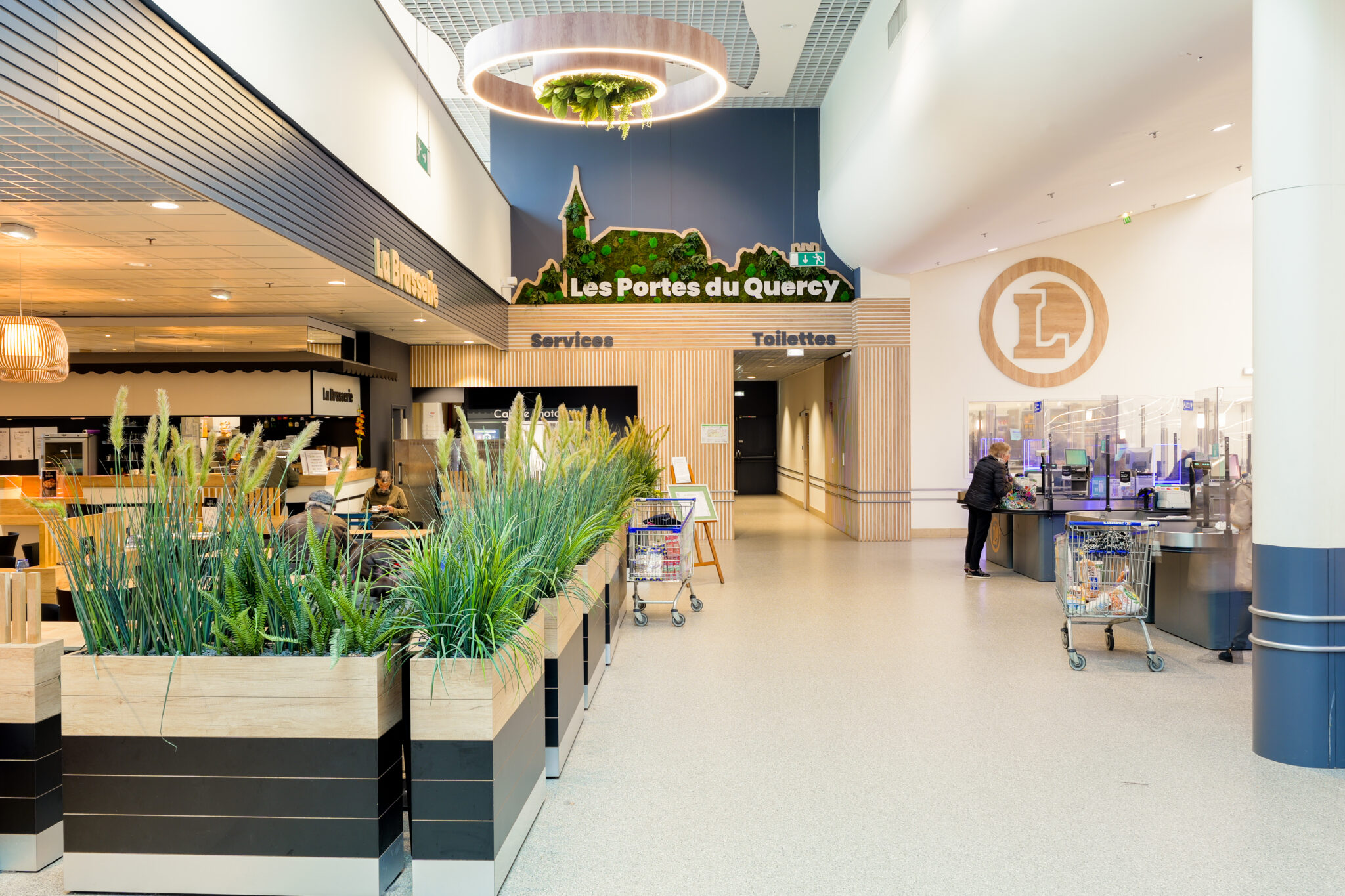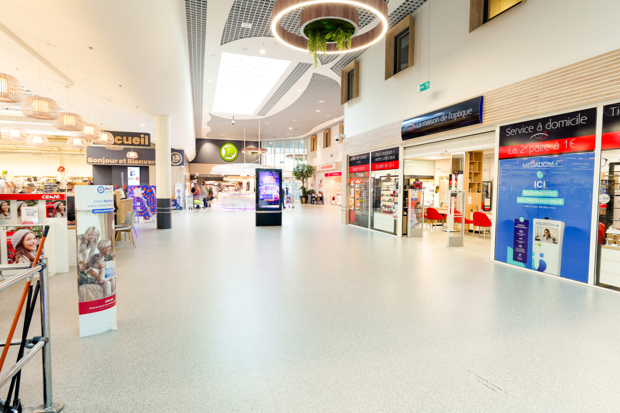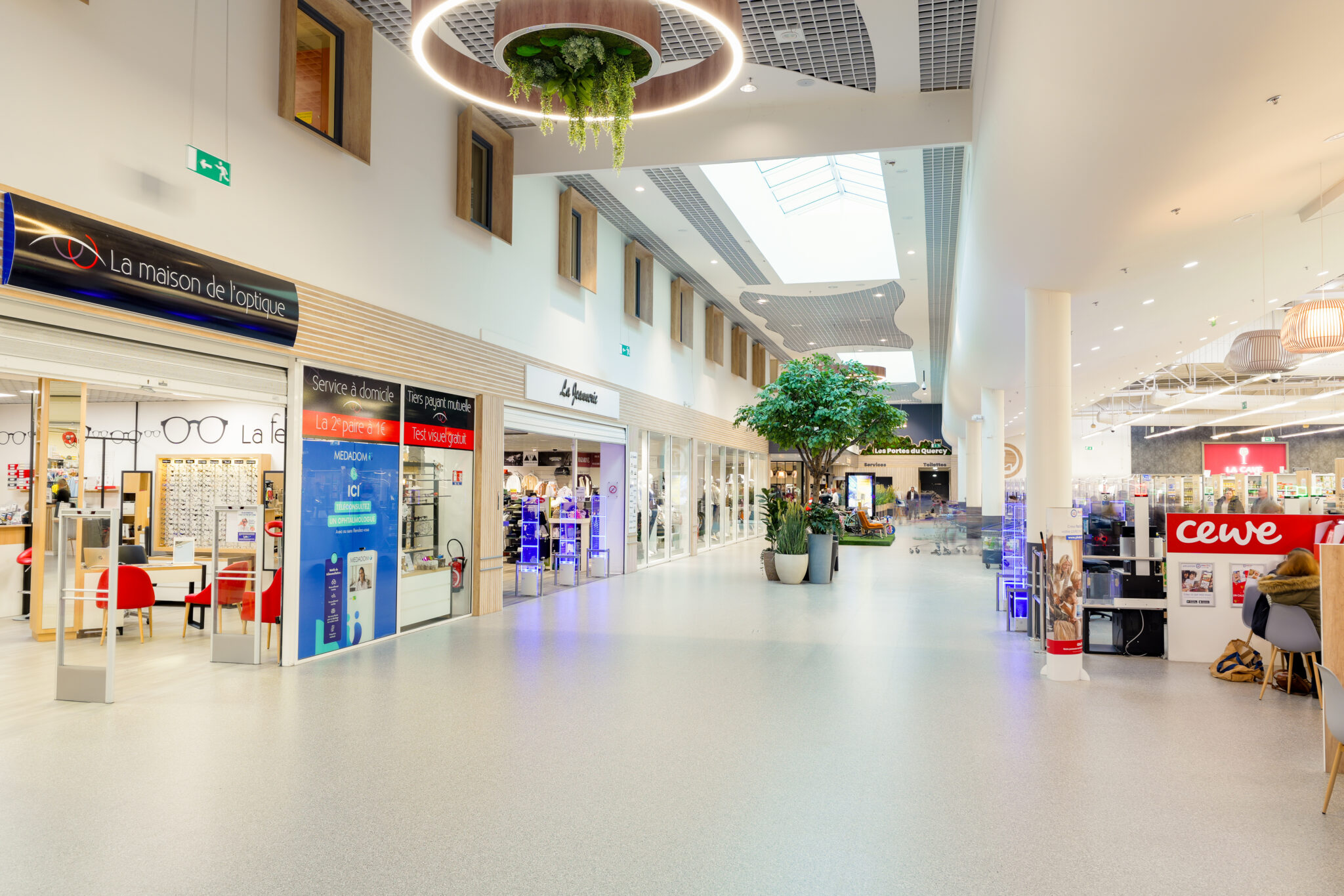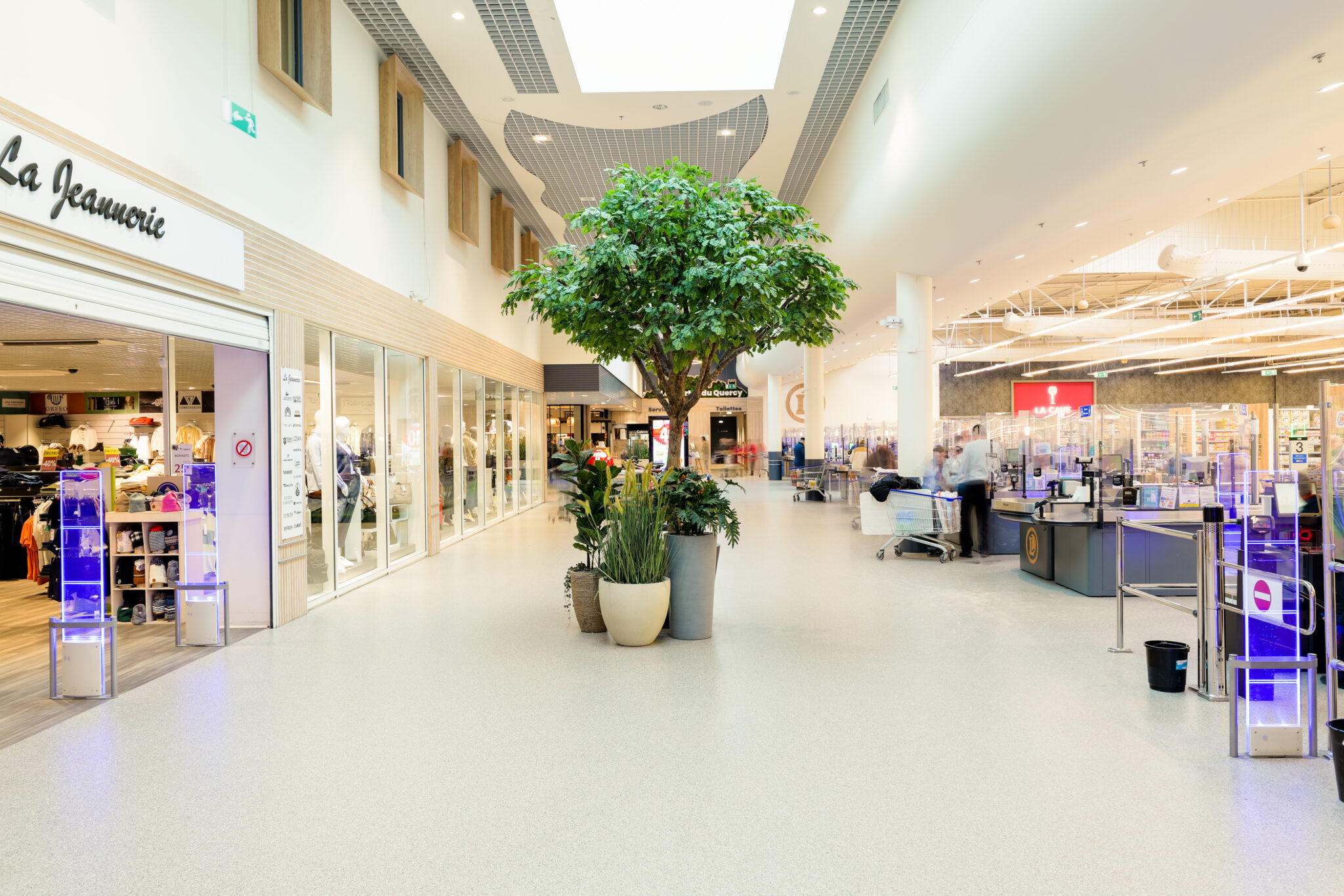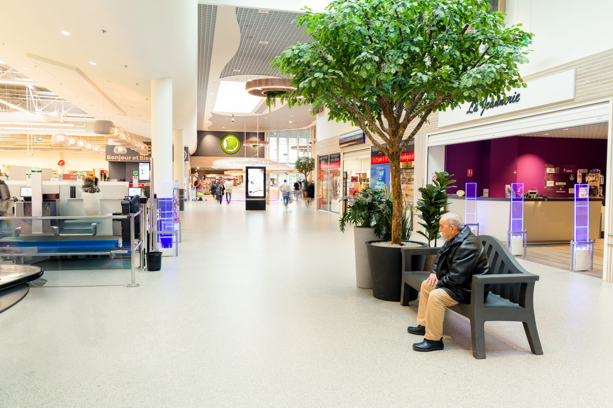 L’ensemble contribuent à créer une ambiance accueillante et agréable. Le traitement autour des devantures des boutiques composés de panneaux de fond, qu’ils soient blancs avec des tasseaux en bois ou gris avec des tasseaux gris, apportent une atmosphère chaleureuse, une harmonie visuelle et une esthétique moderne à cette galerie.