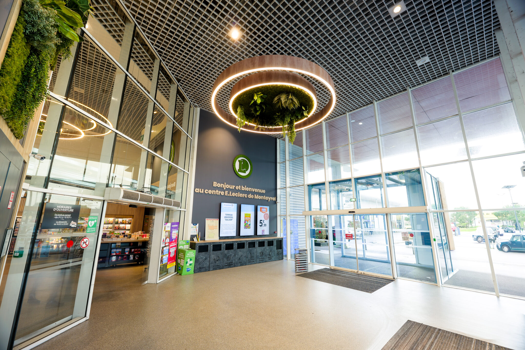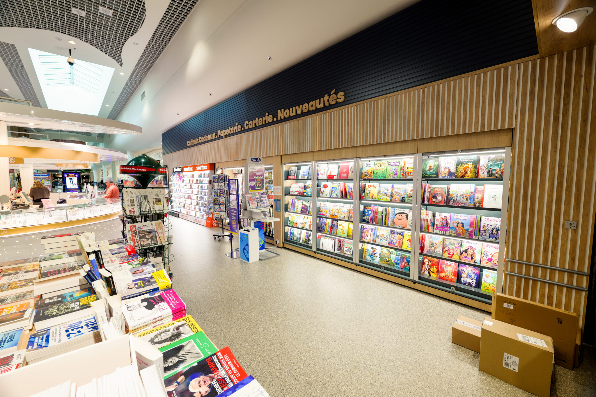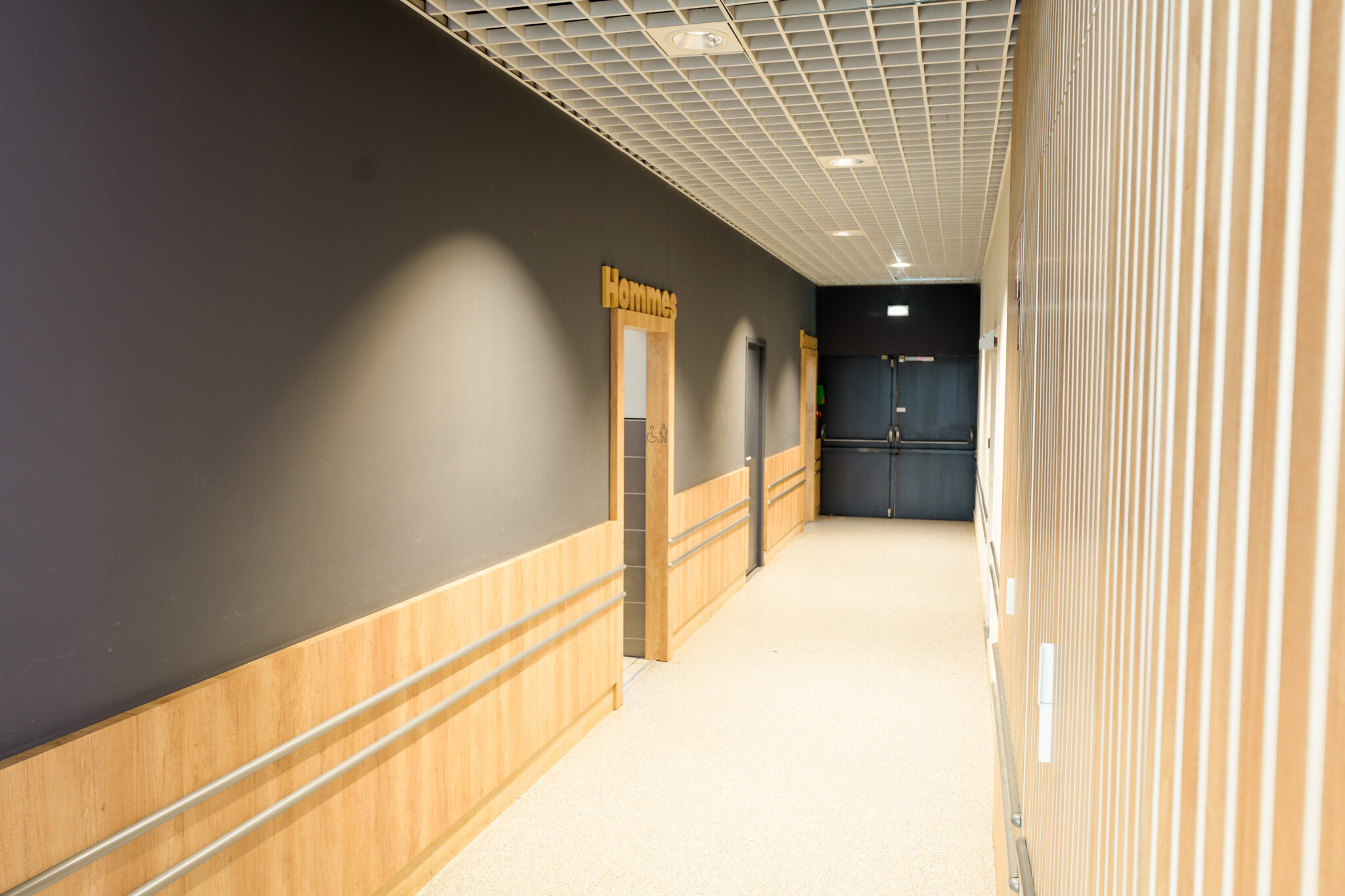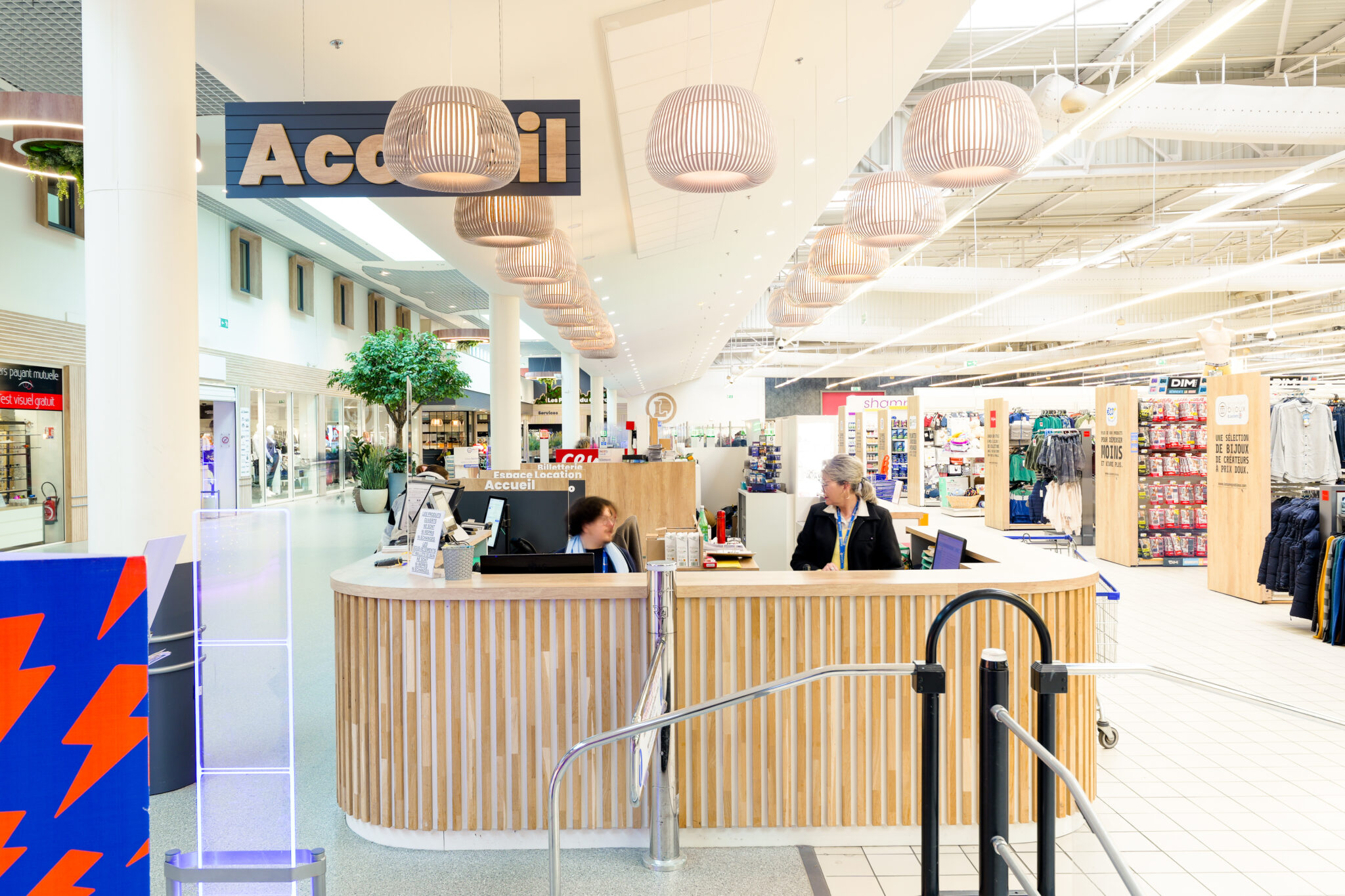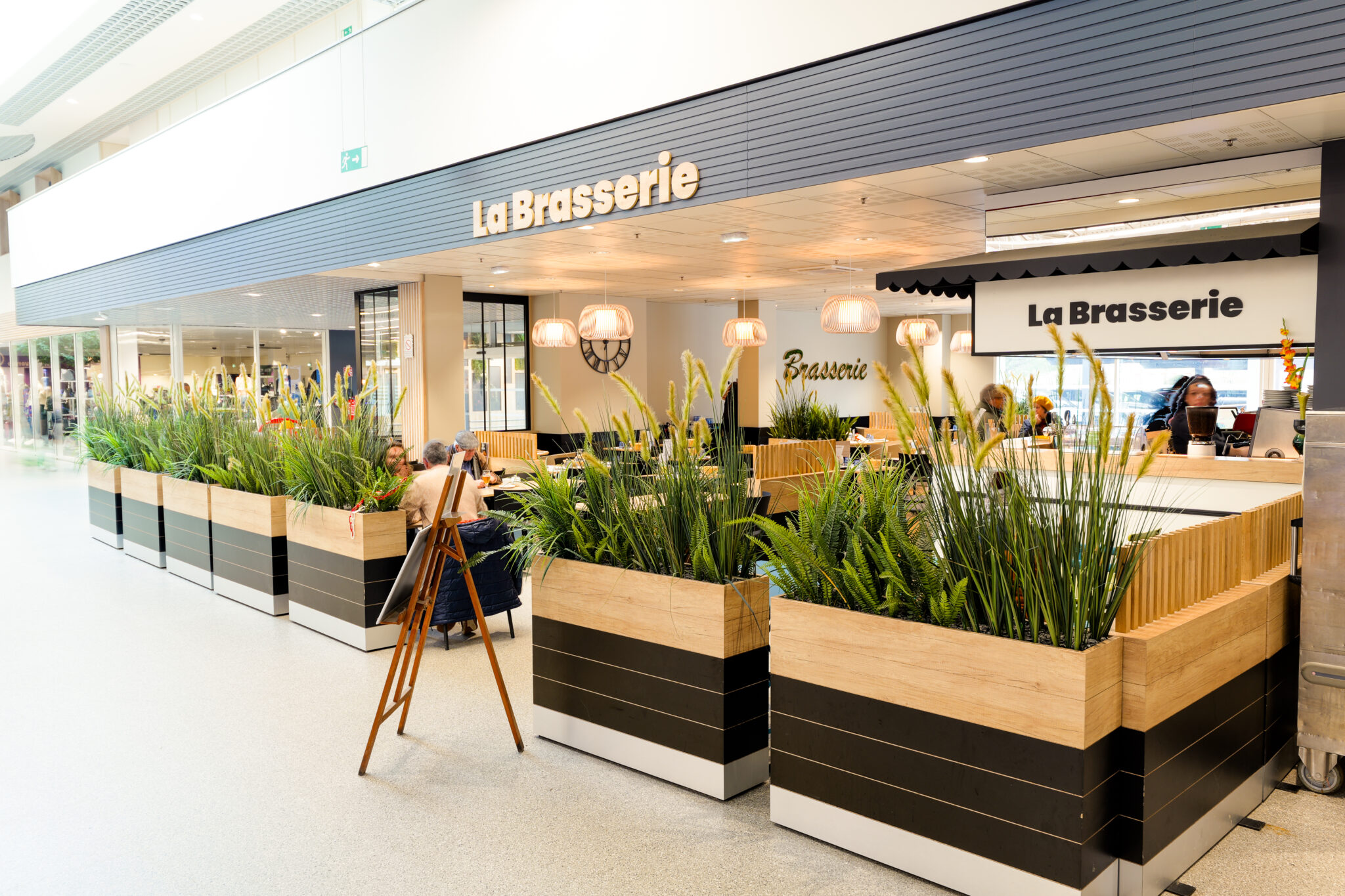 L’ensemble contribuent à créer une ambiance accueillante et agréable. Le traitement autour des devantures des boutiques composés de panneaux de fond, qu’ils soient blancs avec des tasseaux en bois ou gris avec des tasseaux gris, apportent une atmosphère chaleureuse, une harmonie visuelle et une esthétique moderne à cette galerie.