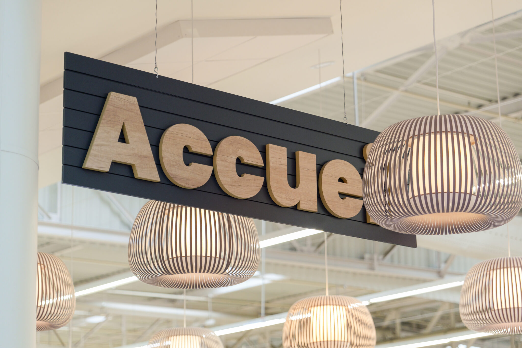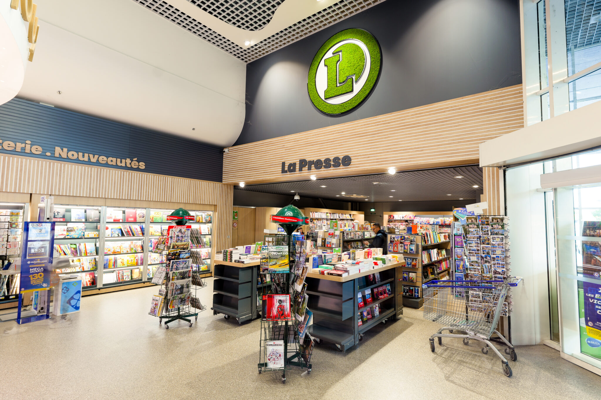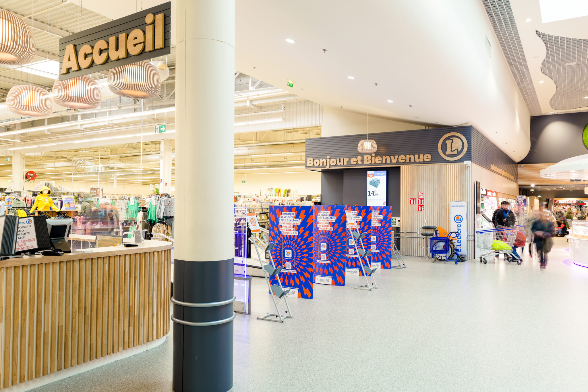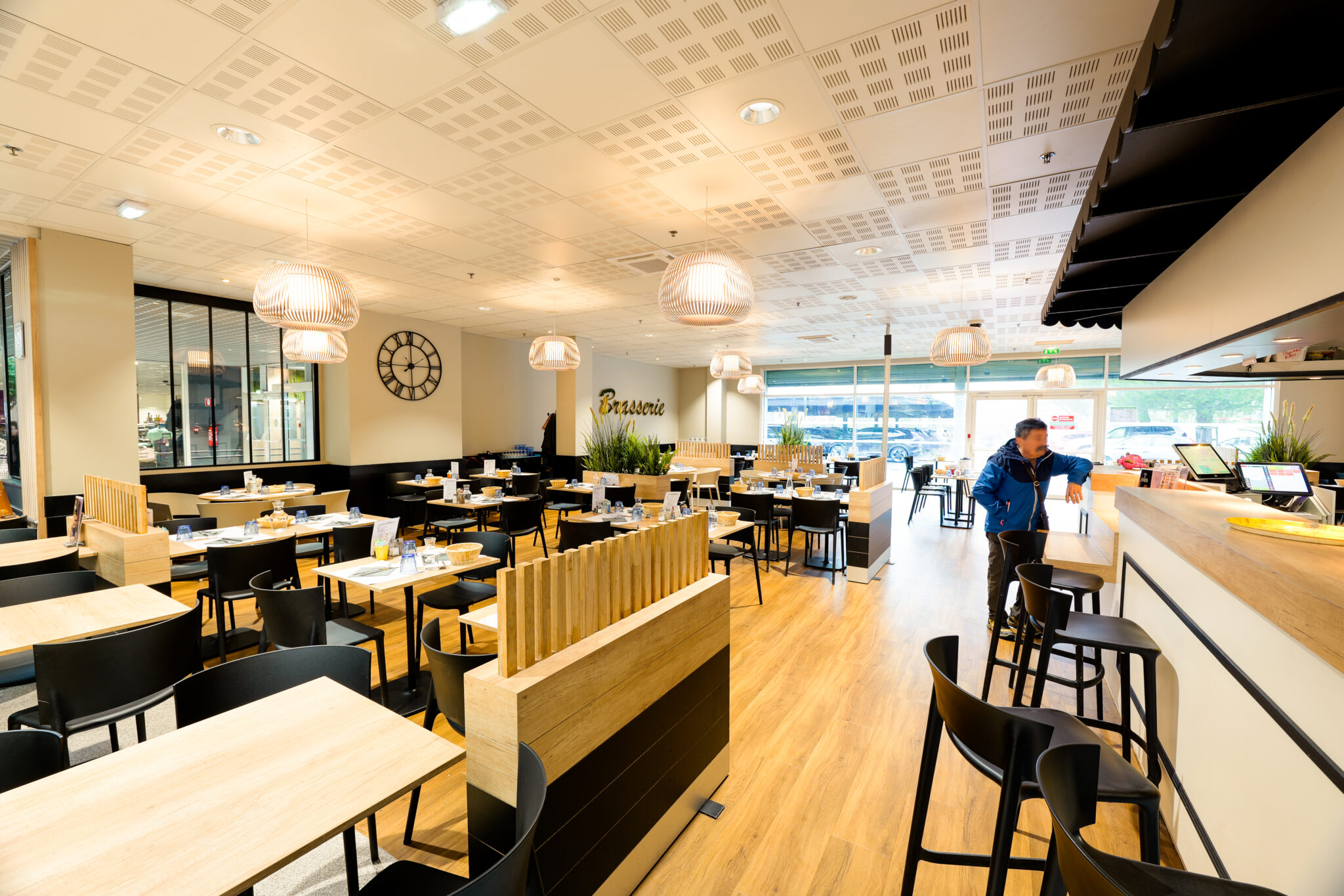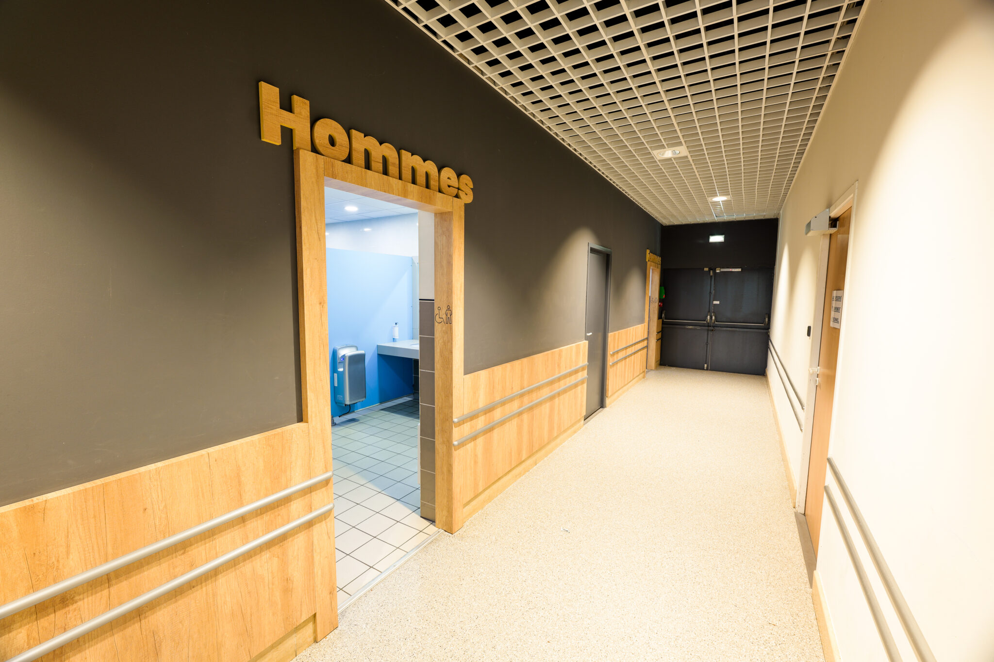 L’ensemble contribuent à créer une ambiance accueillante et agréable. Le traitement autour des devantures des boutiques composés de panneaux de fond, qu’ils soient blancs avec des tasseaux en bois ou gris avec des tasseaux gris, apportent une atmosphère chaleureuse, une harmonie visuelle et une esthétique moderne à cette galerie.