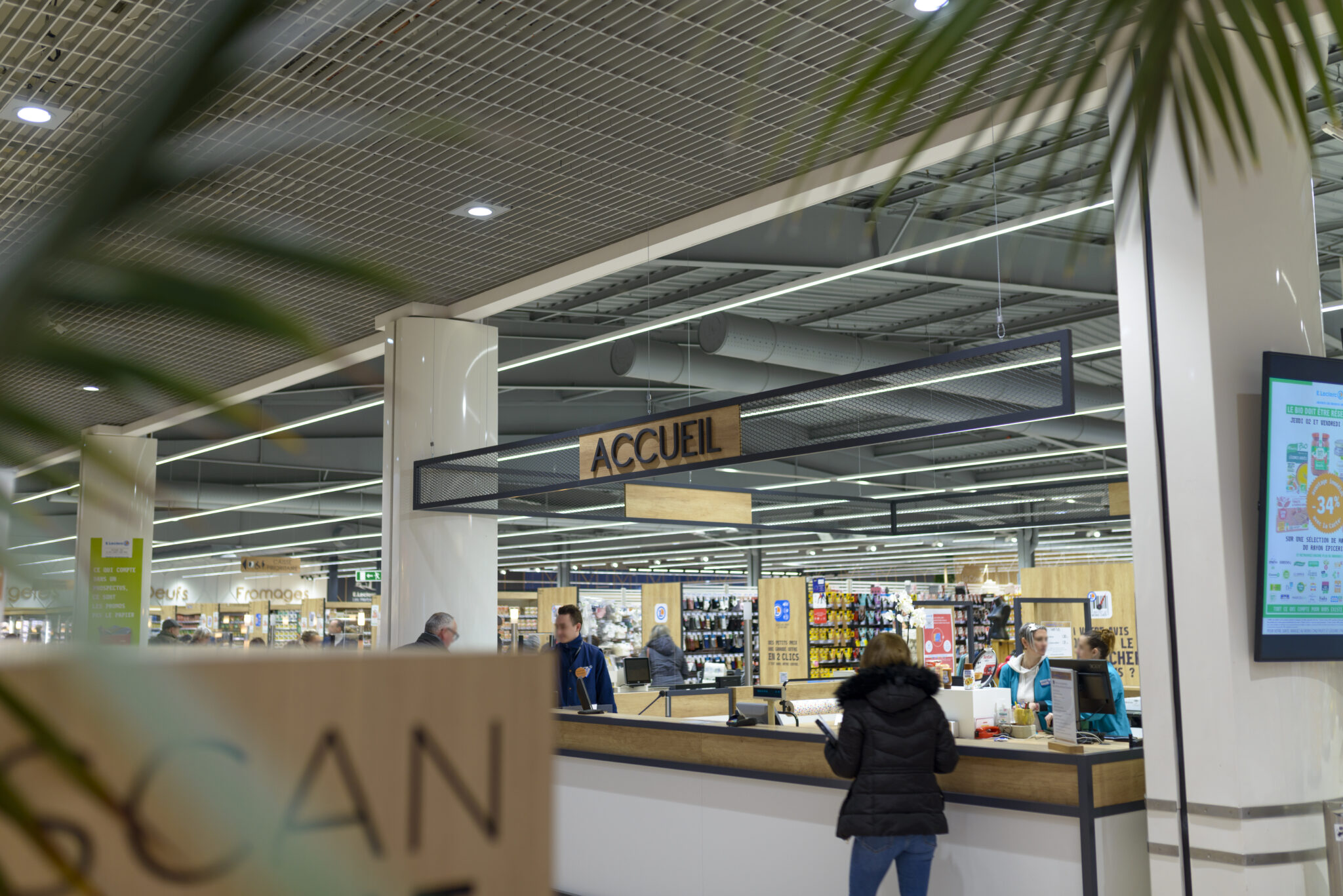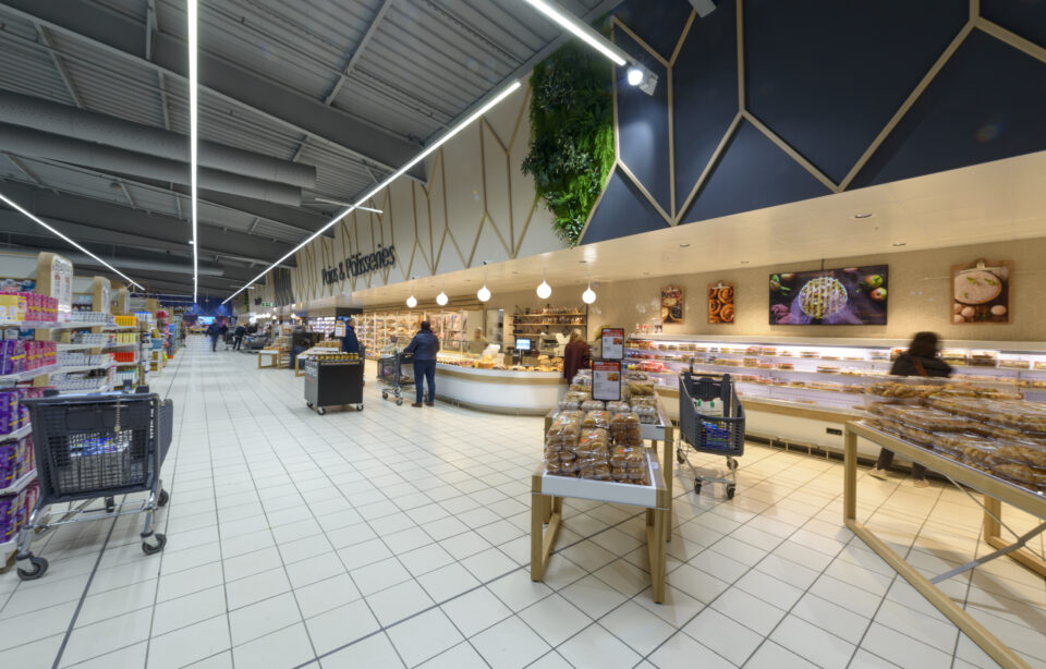 Des enseignes fines et élégantes accentuent chaque métier traditionnel. Des faïences géométriques de couleurs, utilisées pour chaque arrière- comptoirs des métiers du frais, ajoutent de la variété et de la vivacité à l’environnement. Chaque section du magasin a sa propre couleur de faïence, ce qui crée une séparation visuelle entre les différentes zones et facilite l’orientation des clients.