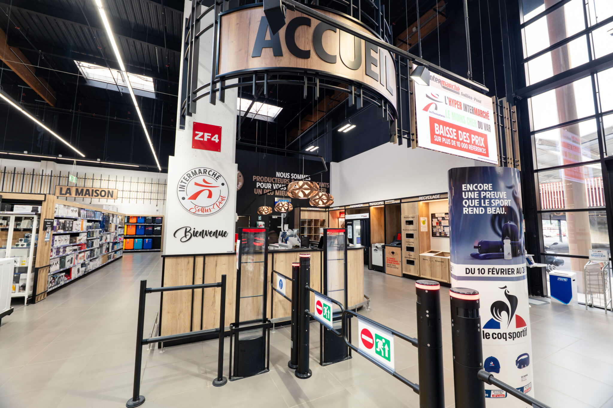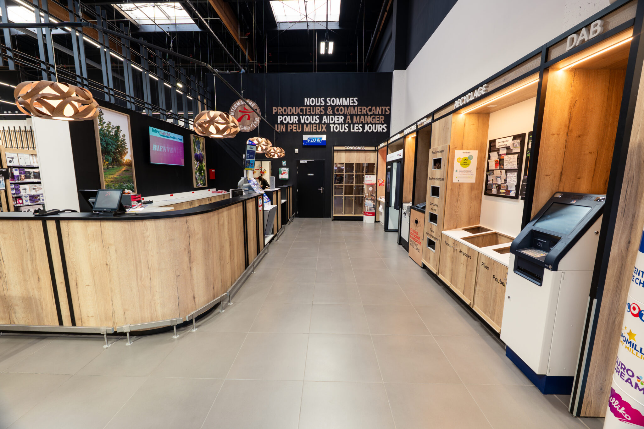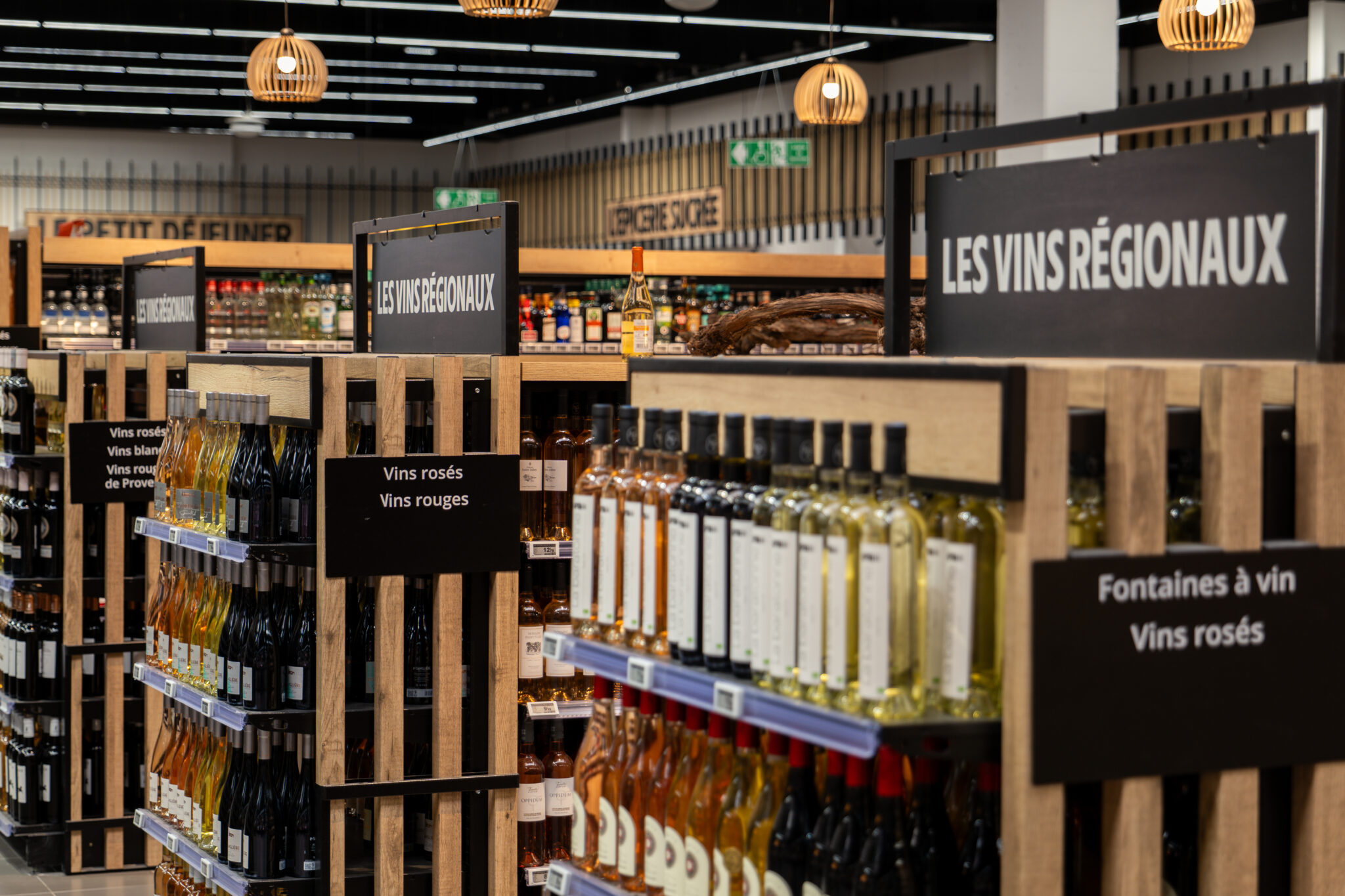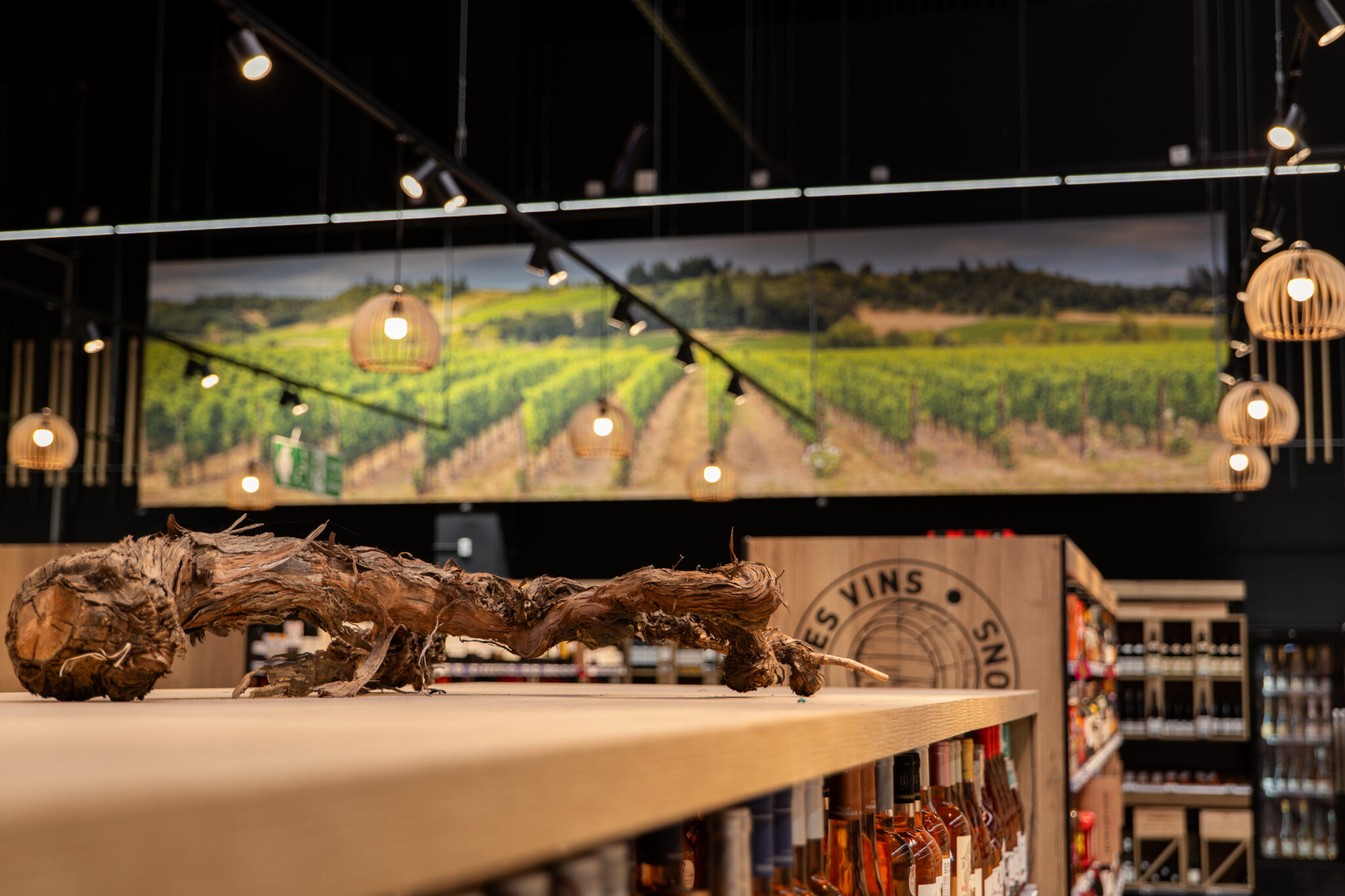 Enfin, le magasin intègre également une dimension locale affirmée avec un clin d’œil au pays de la figue. Un visuel grand format d’une figue en bout de ligne de caisses, complété par des tableaux en arrière-comptoir de l’accueil, crée un fil conducteur graphique et identitaire en lien avec le territoire.