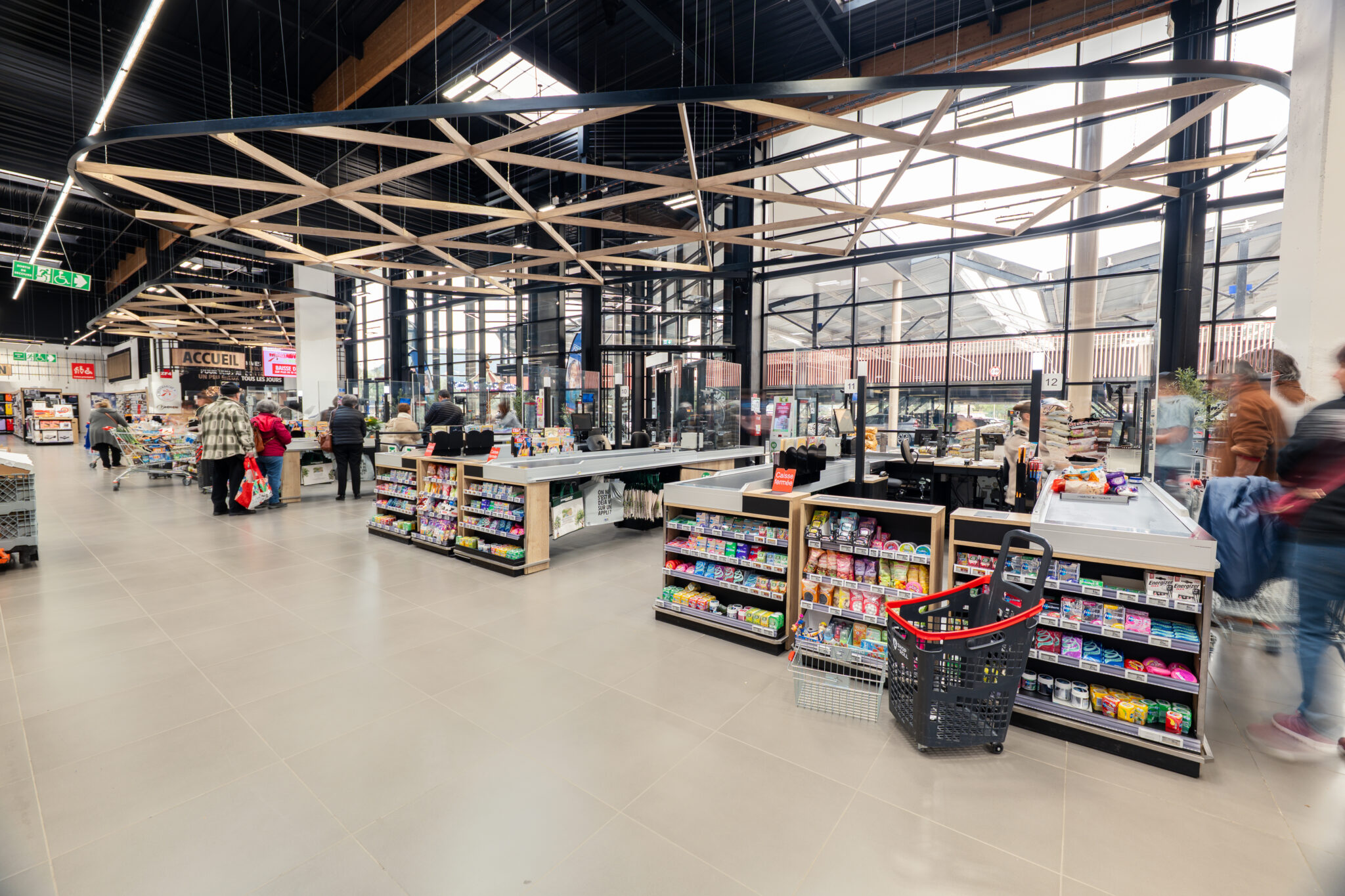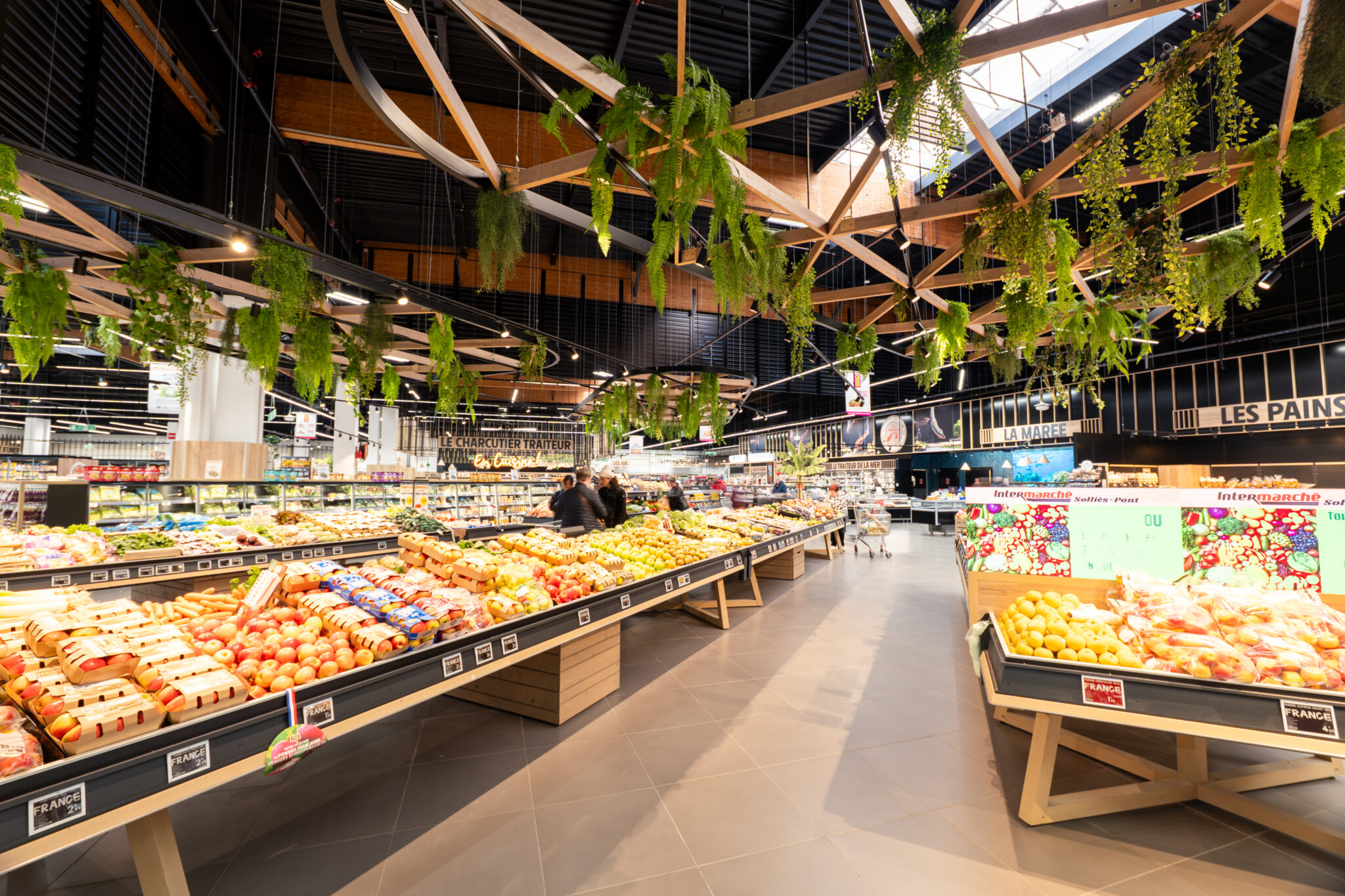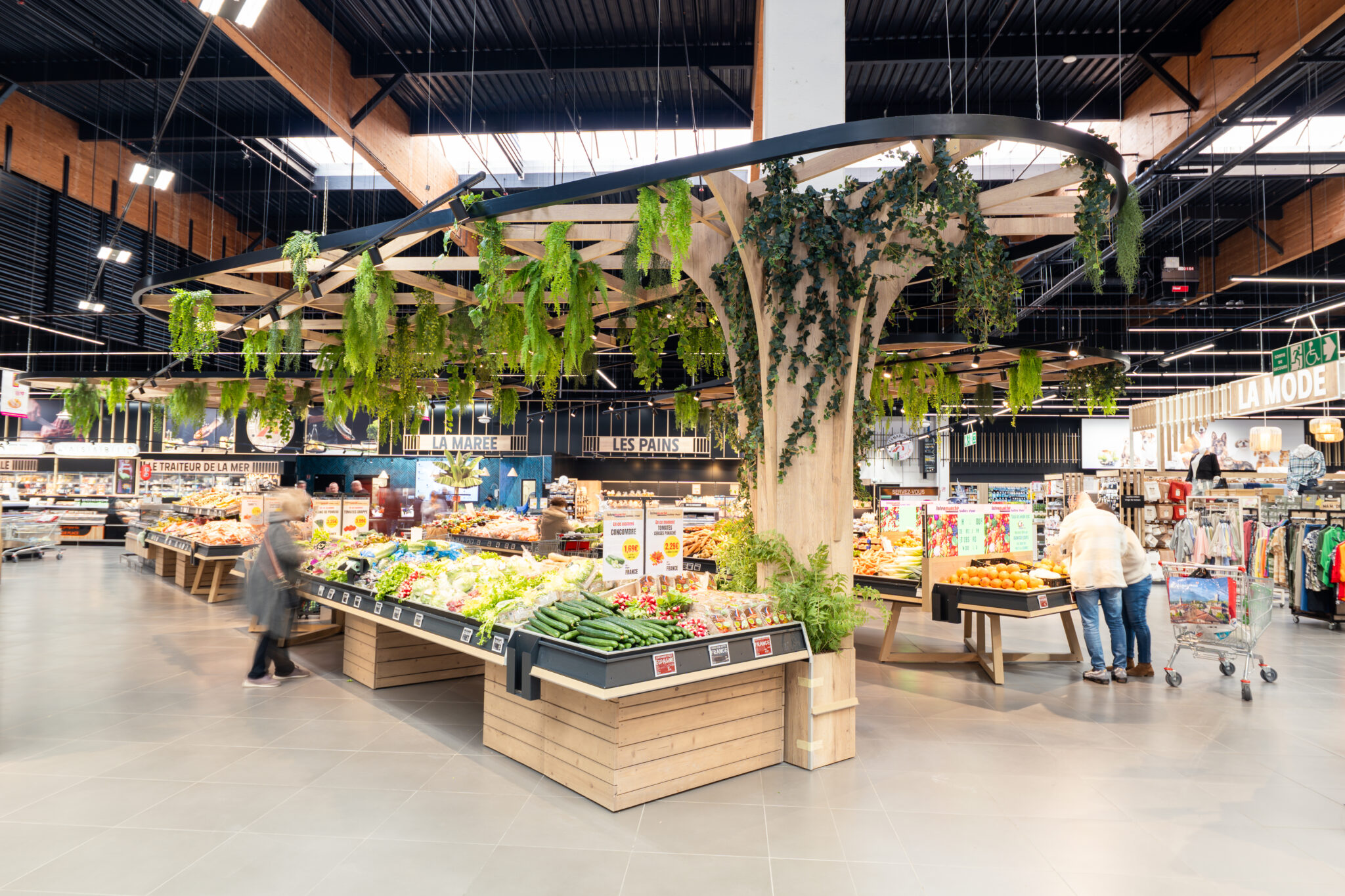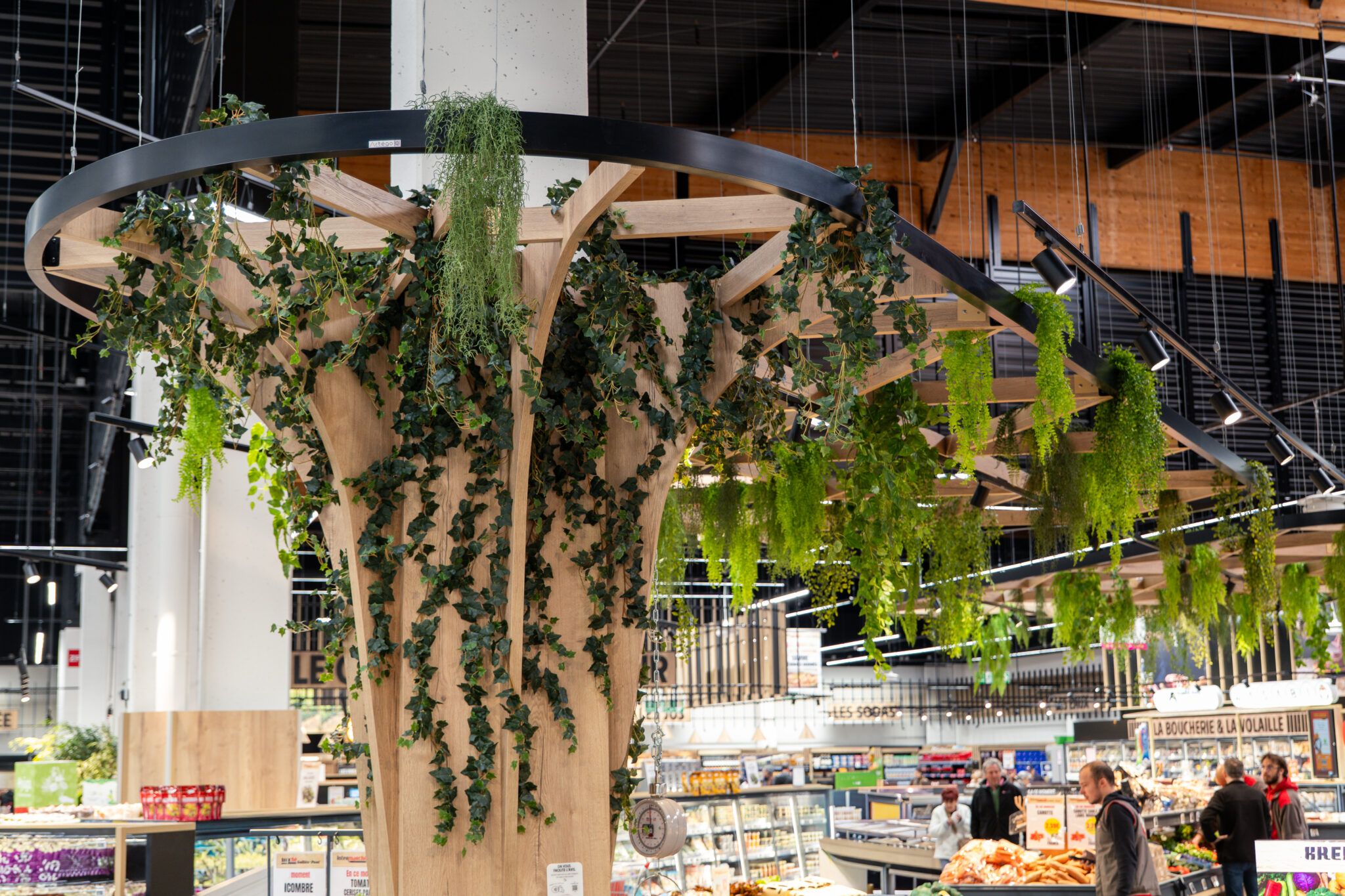 Les volumes sont animés par des canopées en forme de pétales, installées notamment au-dessus de la ligne de caisses et du rayon fruits et légumes. Elles introduisent une dimension plus organique dans l’espace, tout en conservant une certaine rigueur dans leur structure. Au niveau des fruits et légumes, des végétaux suspendus viennent compléter ces éléments et renforcer l’impression de fraîcheur et de naturalité, créant une atmosphère immersive et vivante.