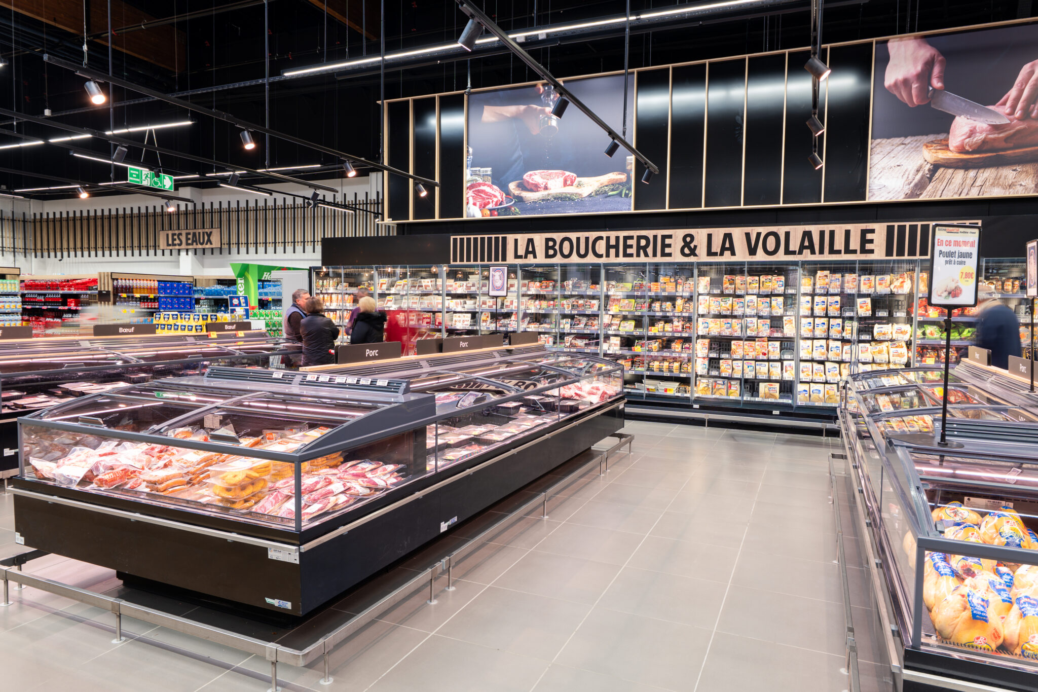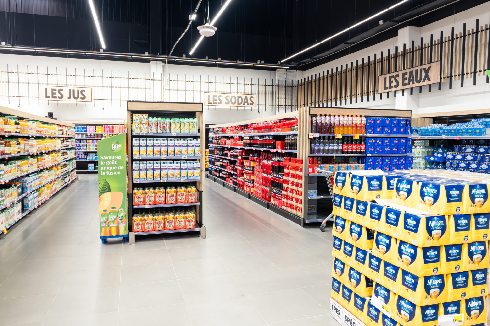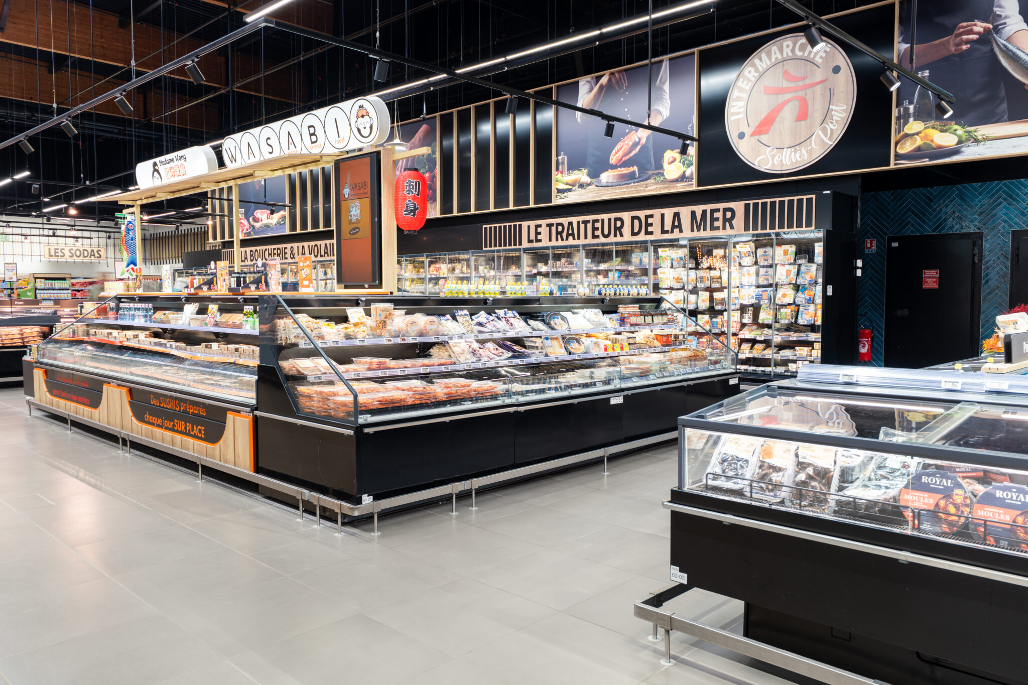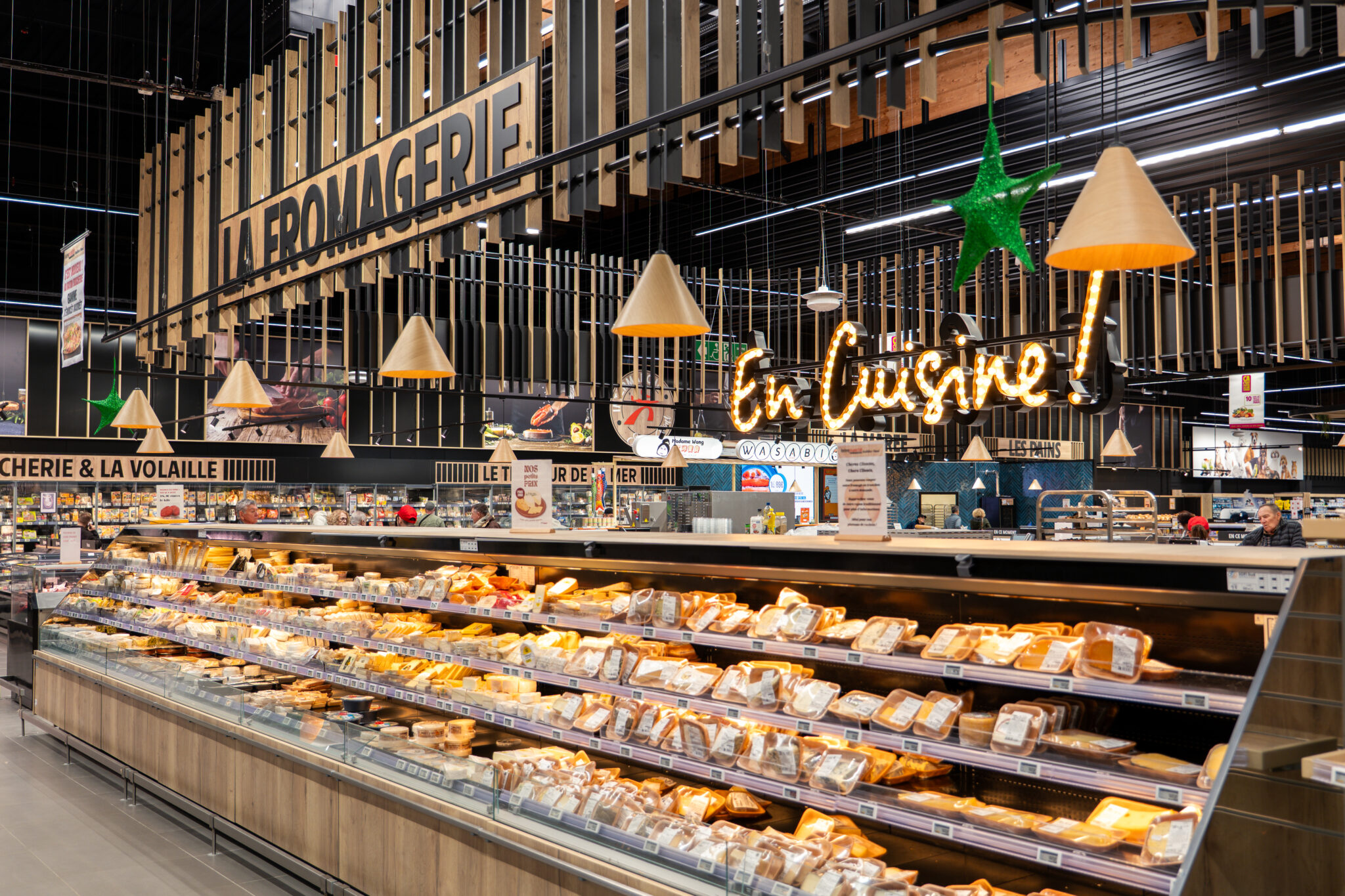 Les volumes sont animés par des canopées en forme de pétales, installées notamment au-dessus de la ligne de caisses et du rayon fruits et légumes. Elles introduisent une dimension plus organique dans l’espace, tout en conservant une certaine rigueur dans leur structure. Au niveau des fruits et légumes, des végétaux suspendus viennent compléter ces éléments et renforcer l’impression de fraîcheur et de naturalité, créant une atmosphère immersive et vivante.