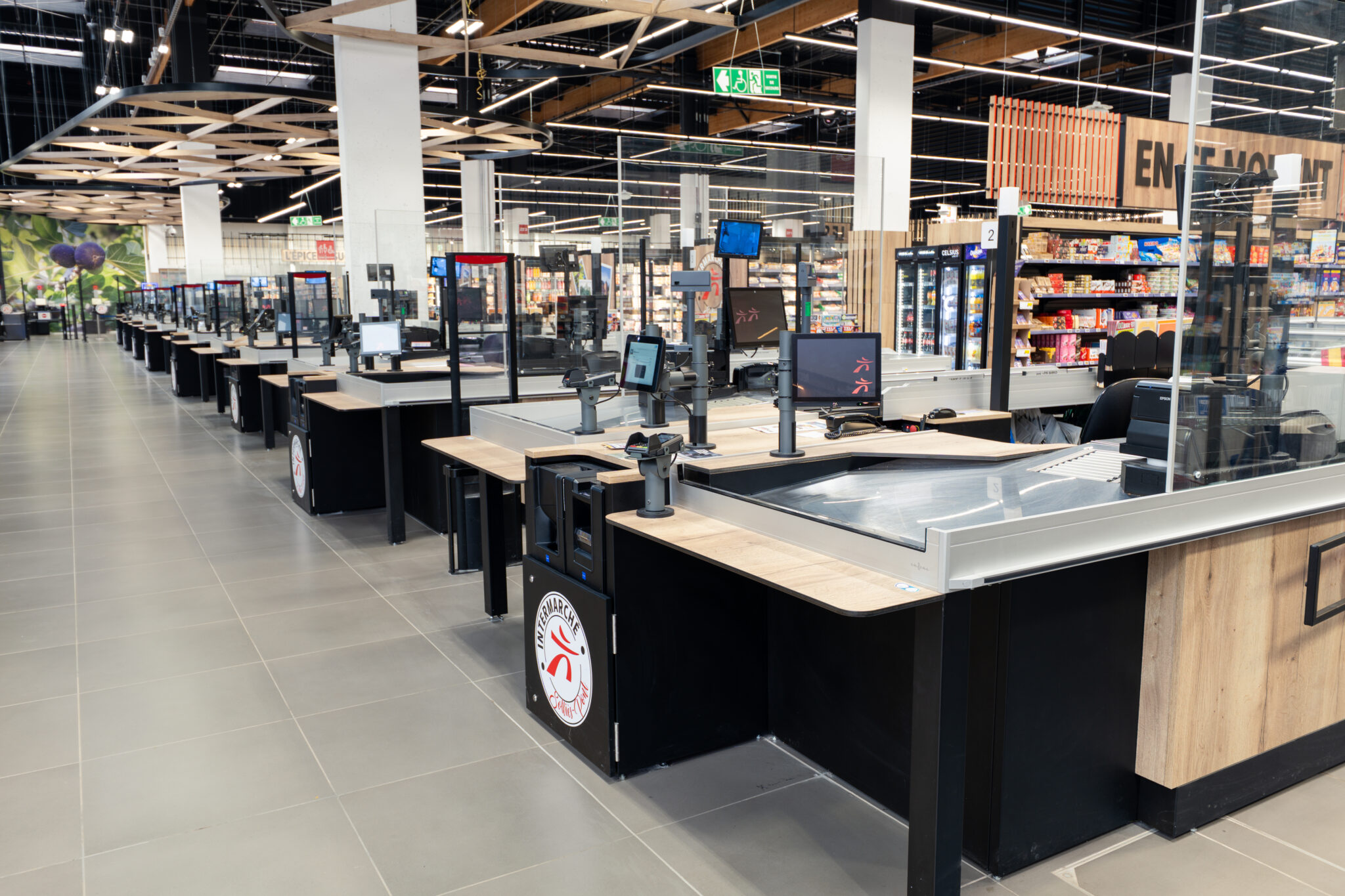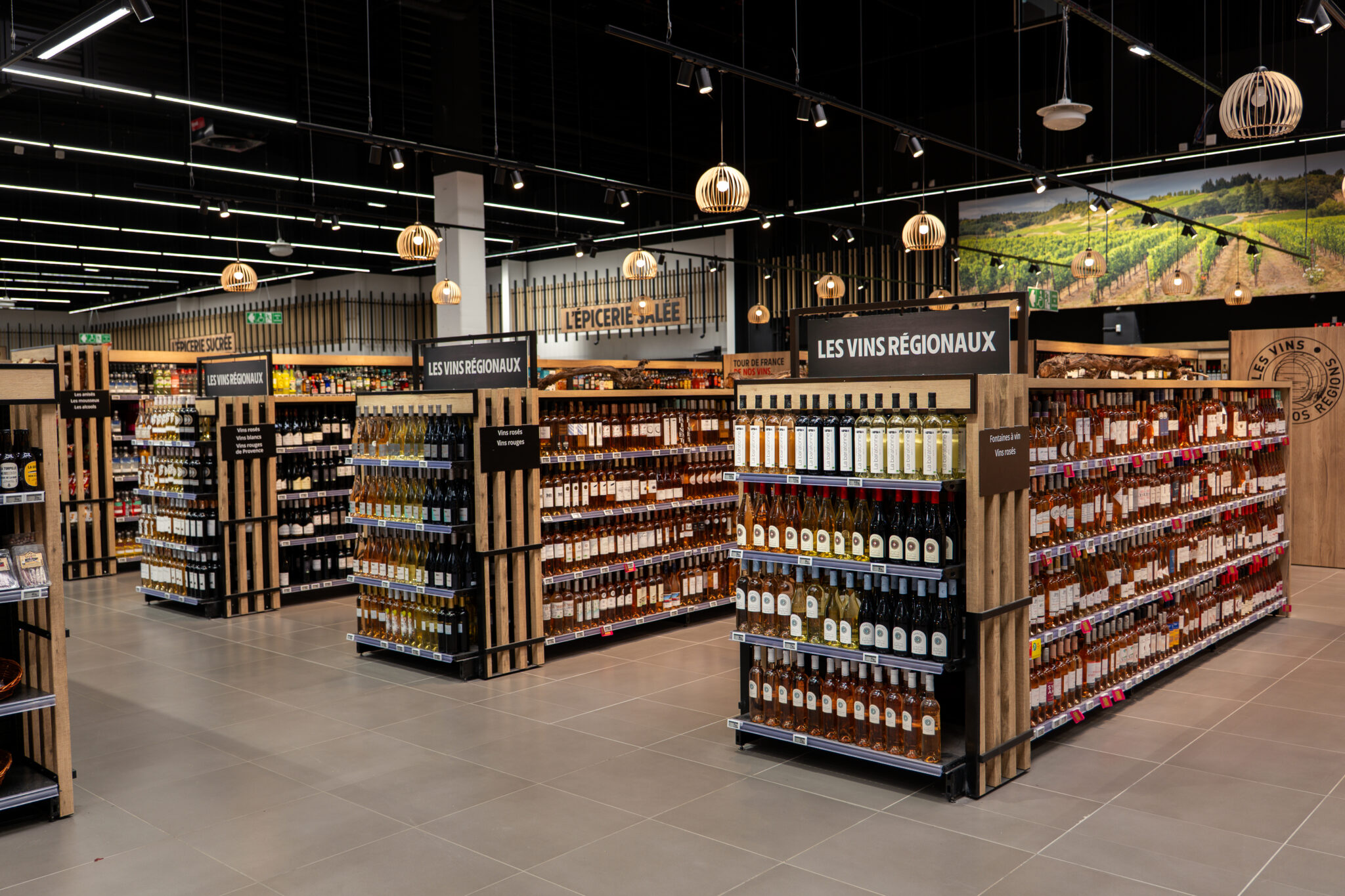 Cette écriture se prolonge dans l’ensemble du parcours client. Le bandeau périphérique en échelle organise les rayons et facilite leur repérage, tout en apportant un rythme visuel structuré. Les joues de gondoles et le panneautage des poteaux reprennent ces codes, assurant une continuité esthétique. L’inspiration industrielle, présente mais maîtrisée, vient renforcer la fonctionnalité et la clarté sans nuire à la sensation de chaleur portée par le bois.