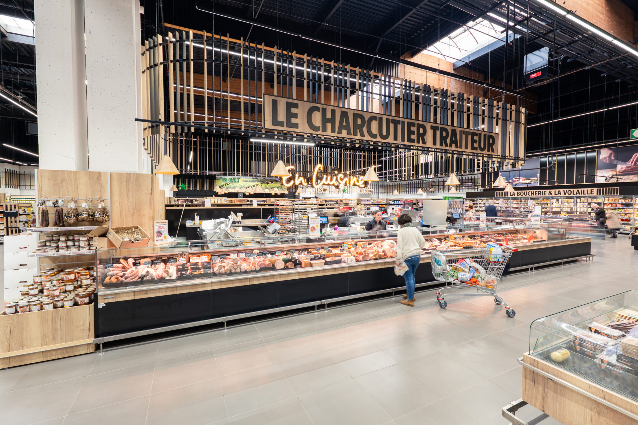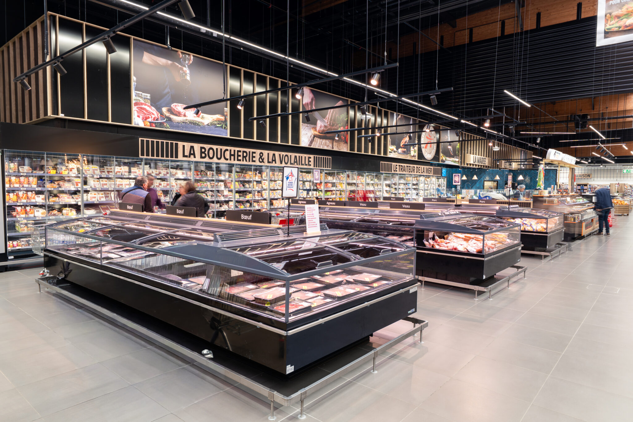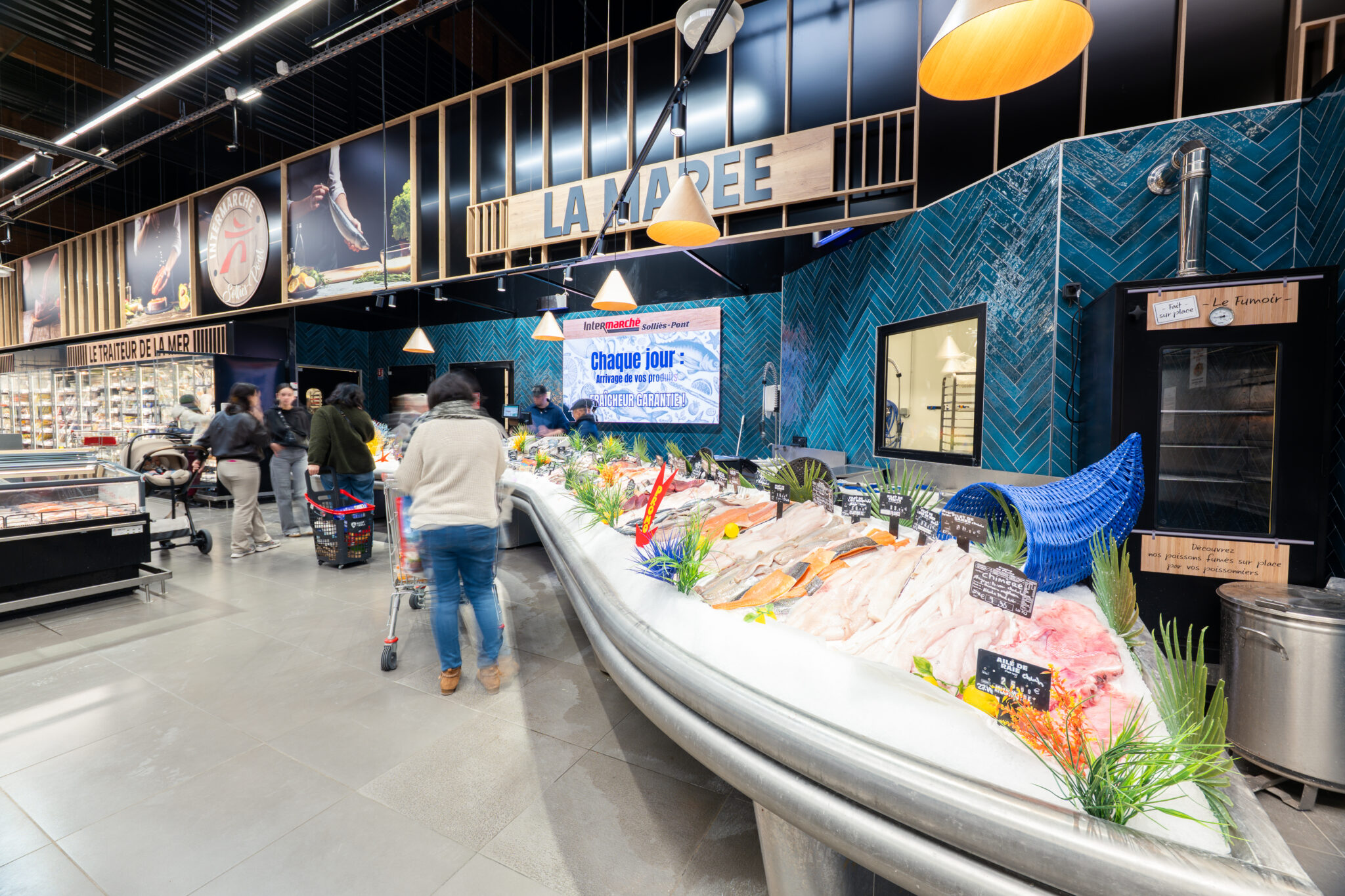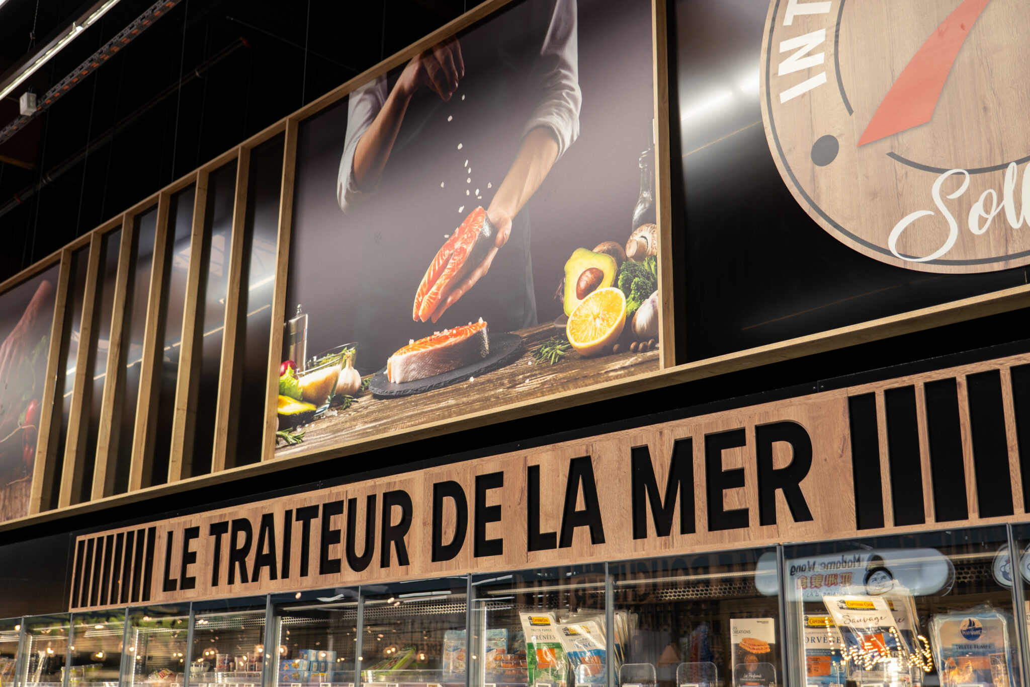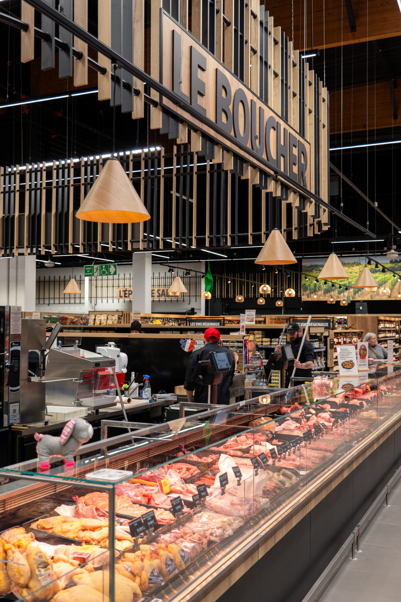 Les comptoirs traditionnels prolongent cette mise en scène en valorisant le geste métier. Des visuels illustrant le travail de la viande, du poisson ou du pain rappellent l’univers artisanal et renforcent le lien entre produit, savoir-faire et authenticité.